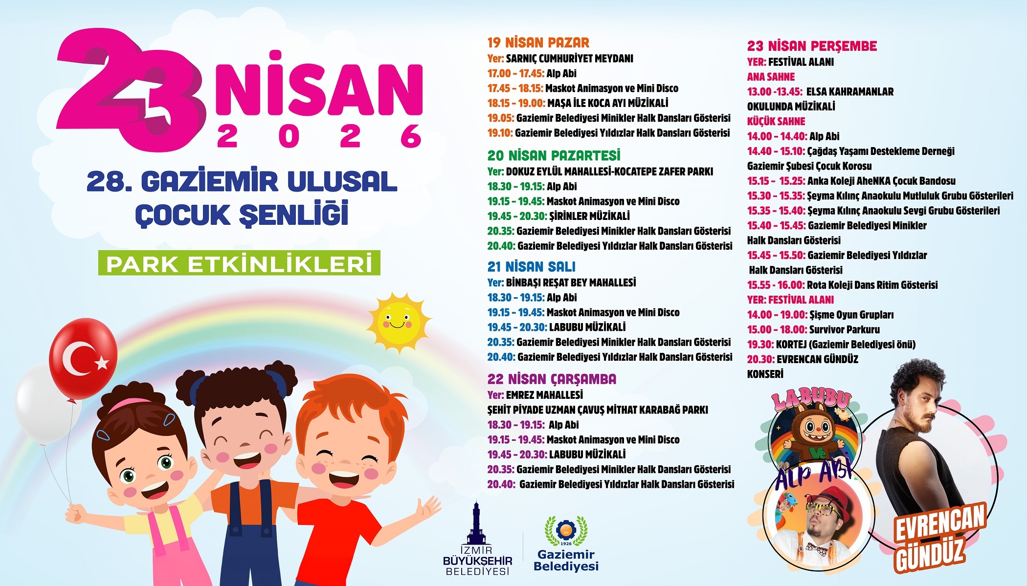 Her gün farklı bir mahallede düzenlenecek etkinliklerle, çocuklar gönüllerince eğlenerek bayram sevincini doyasıya yaşayacak. Şenlik kapsamında sahnelenecek müzikallerle çocuklar sevdikleri çizgi film karakterleriyle bir araya gelecek; maskot, animasyon ve sahne gösterileriyle keyifli anlar yaşayacak. Programda Maşa ile Koca Ayı, Şirinler, Labubu ve Elsa Kahramanlar Okulu müzikalleri yer alırken, Alp Abi sahne gösterisi de çocuklarla buluşacak. Gaziemir Belediyesi Halk Dansları Topluluğu’nun minikler ve yıldızlar grupları da performanslarıyla şenliğe renk katacak.