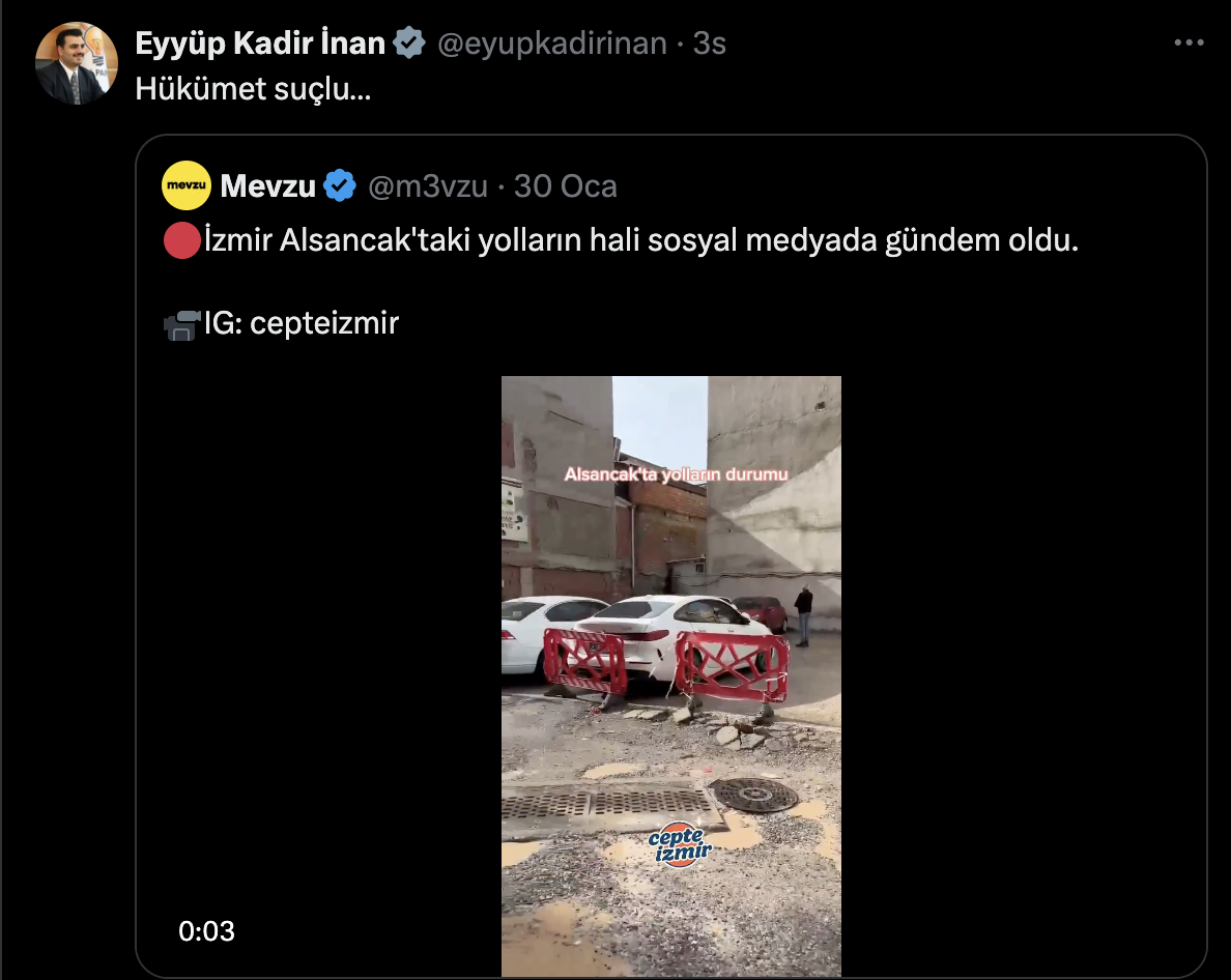 Yaşananlara ilişkin tepkiler siyaset cephesinde de karşılık buldu. AK Parti Genel Sekreteri ve İzmir Milletvekili Eyyüp Kadir İnan, söz konusu görüntüleri sosyal medya hesabından paylaşarak İzmir Büyükşehir Belediyesi’ni eleştirdi. İnan, paylaşımında “Hükümet suçlu…” ifadesini kullanarak yerel yönetimlere gönderme yaptı.