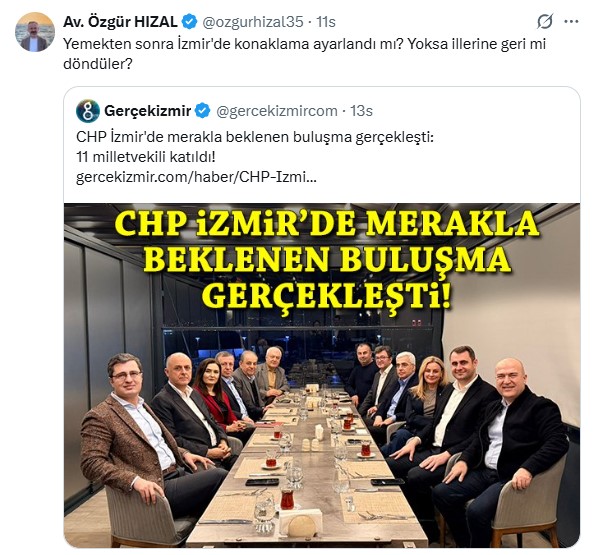 AK Parti Genel Sekreter Yardımcısı Özgür Hızal, sosyal medya hesabından CHP İl Başkanı Güç ve CHP'li vekillerin görüşmesinden kareyi paylaştı, " Yemekten sonra İzmir'de konaklama ayarlandı mı? Yoksa illerine geri mi döndüler?" ifadelerini kullandı.