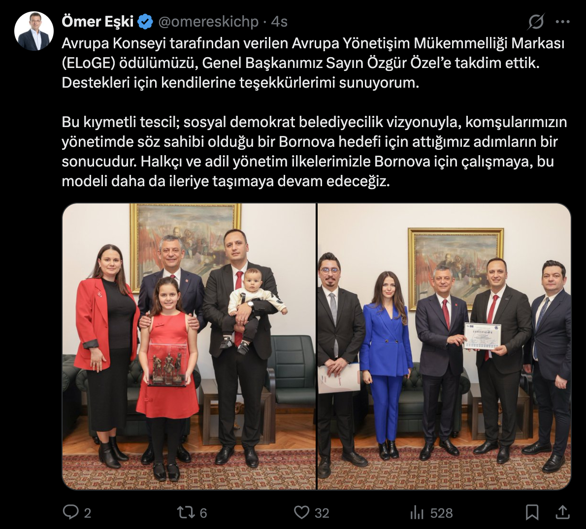 Bornova’da sosyal demokrat belediyecilik anlayışı doğrultusunda çalışmalar yürüttüklerini ifade eden Eşki, yerel yönetimde halkın karar süreçlerine katılımını önemsediklerini vurgulayarak şu ifadeleri kullandı: "Avrupa Konseyi tarafından verilen Avrupa Yönetişim Mükemmelliği Markası (ELoGE) ödülümüzü, Genel Başkanımız Sayın Özgür Özel’e takdim ettik. Destekleri için kendilerine teşekkürlerimi sunuyorum. Bu kıymetli tescil; sosyal demokrat belediyecilik vizyonuyla, komşularımızın yönetimde söz sahibi olduğu bir Bornova hedefi için attığımız adımların bir sonucudur. Halkçı ve adil yönetim ilkelerimizle Bornova için çalışmaya, bu modeli daha da ileriye taşımaya devam edeceğiz."