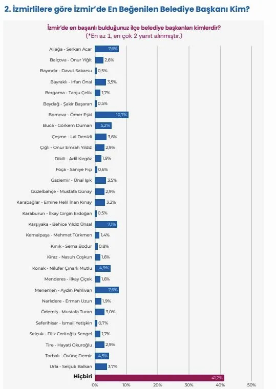 Buca Belediye Başkanı Görkem Duman, Torbalı Belediye Başkanı Övünç Demir ile Konak Belediye Başkanı Nilüfer Çınarlı Mutlu gibi isimlerin oranları yüksek çıktı.