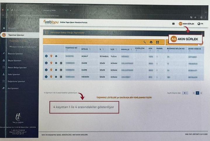 Bakan Gürlek'in, açıklamalarının ardından, web tapuda üzerine kayıtlı taşınmazları gösteren belgenin kopyası gazetecilerle paylaşıldı.