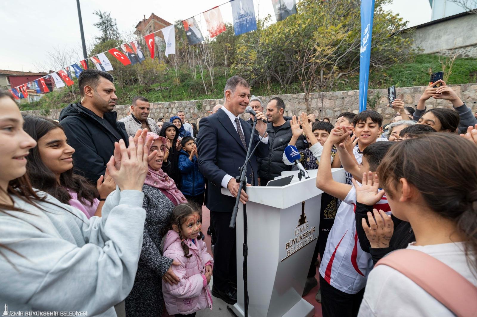 İzmir Büyükşehir Belediyesi’nin öz kaynakları ve personeliyle yapımı tamamlanan parka emek veren teşekkür eden Başkan Tugay kendisine verilen çiçekler için “Bunu bütün İzmir Büyükşehir Belediyesi ailesi adına alıyorum. Parkınız hayırlı olsun. Söz veriyorum; en kısa zamanda yeni tesisler açmak üzere burada olacağız” ifadelerini kullandı.