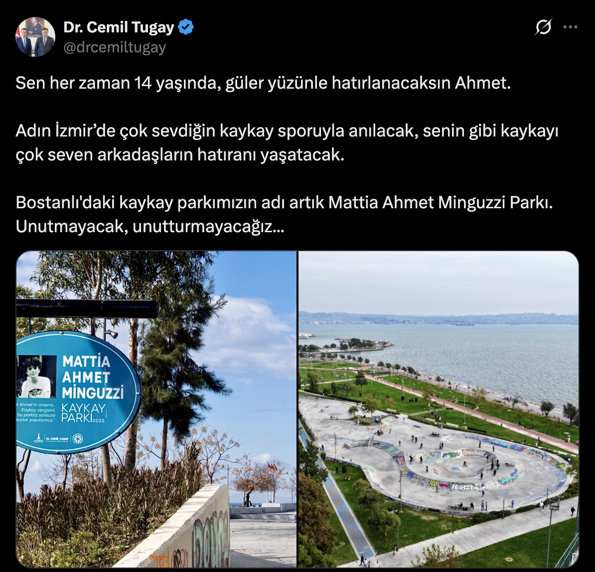 Başkan Tugay paylaşımında, “Sen her zaman 14 yaşında, güler yüzünle hatırlanacaksın Ahmet. Adın İzmir’de çok sevdiğin kaykay sporuyla anılacak, senin gibi kaykayı çok seven arkadaşların hatıranı yaşatacak. Bostanlı'daki kaykay parkımızın adı artık Mattia Ahmet Minguzzi Parkı. Unutmayacak, unutturmayacağız..." ifadelerine yer verdi.