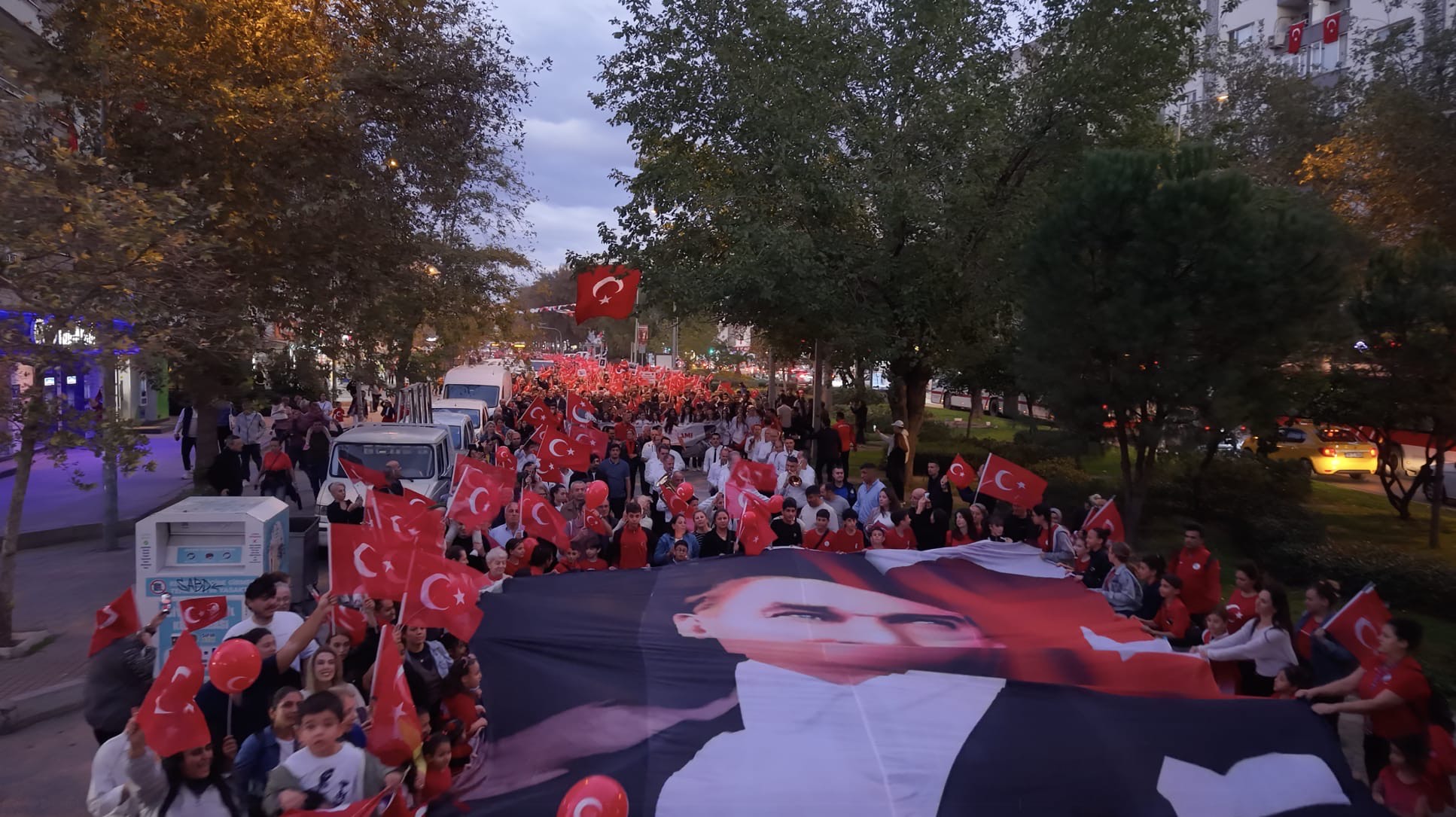 Bayraklı’da 29 Ekim Cumhuriyet Bayramı’nın 102. yılı, kortej yürüyüşü ve konser programıyla büyük bir coşkuyla kutlandı. Özkanlar Migros önünden bando eşliğinde Şehit Hakan Ünal Parkı’na yürüyen binlerce vatandaş; ellerindeki meşalelerle, Atatürk ve Türk bayraklarıyla renkli görüntüler oluşturdu. İlçe sakinleri, evlerinin balkonlarından coşkulu korteje alkışlarla destek verdi.
