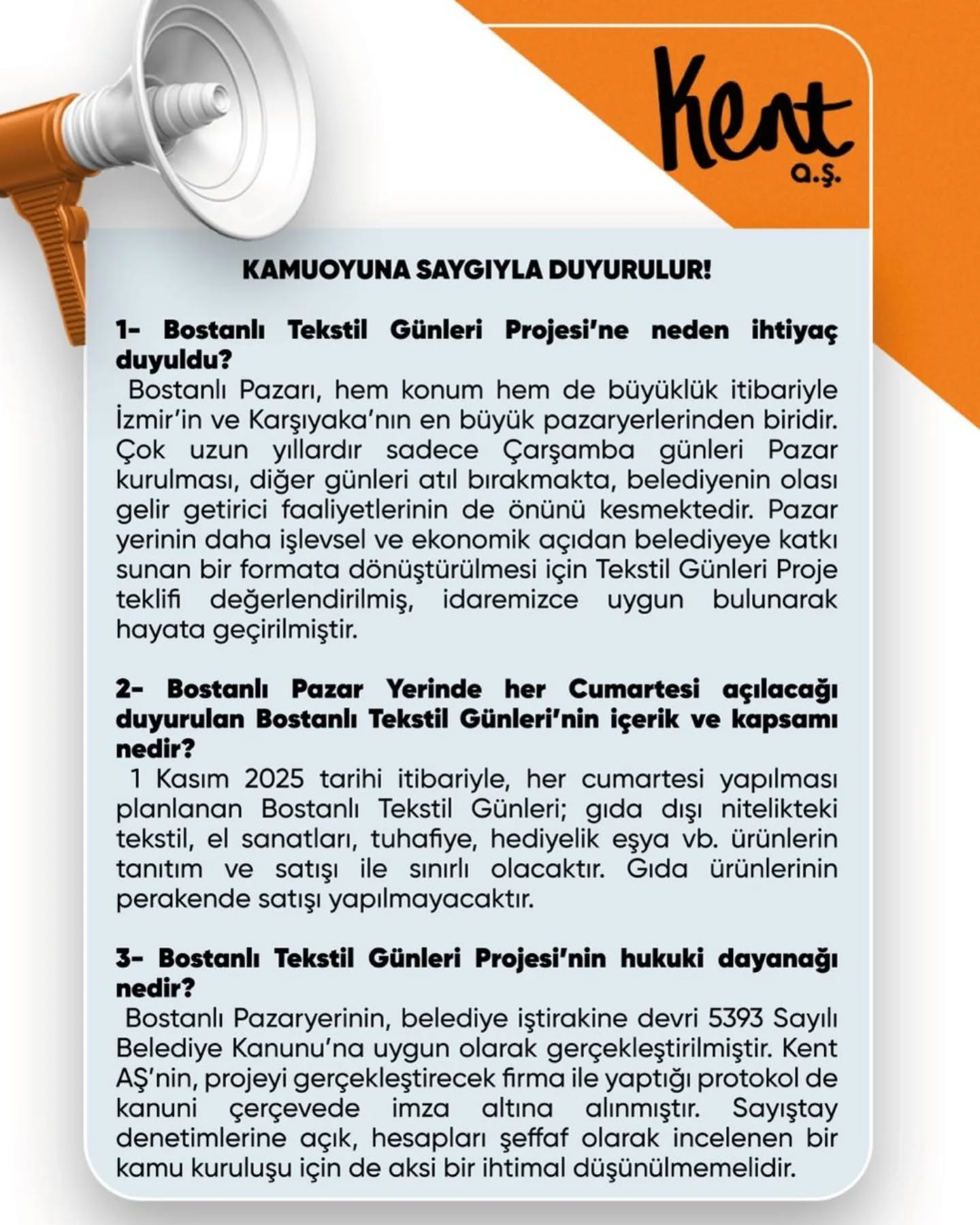 Karşıyaka’nın simgesi haline gelen Bostanlı Pazarı’nın haftada iki güne çıkarılması ve alanın bir şirkete devredilmesi planı, pazarcı esnafının tepkisine neden olurken, belediyeden konuya dair bir açıklama geldi.