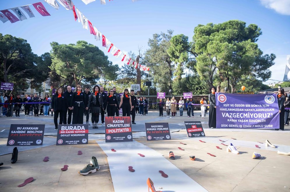 Bornovalı emekçi kadınların 25 Kasım buluşması ise Büyükpark’ta düzenlendi. Etkinlikte DİSK Genel İş 7 No’lu Şube Kadın Komitesi Başkanı Gülistan Tilkici hazırlanan bildiriyi okudu. Kadına yönelik şiddet tiyatral bir sunumla ele alınırken, katılımcılar sloganlar atarak dayanışmanın gücünü ortaya koydu. Program, balonların hep birlikte gökyüzüne bırakılmasıyla simgesel bir mesajla sona erdi.