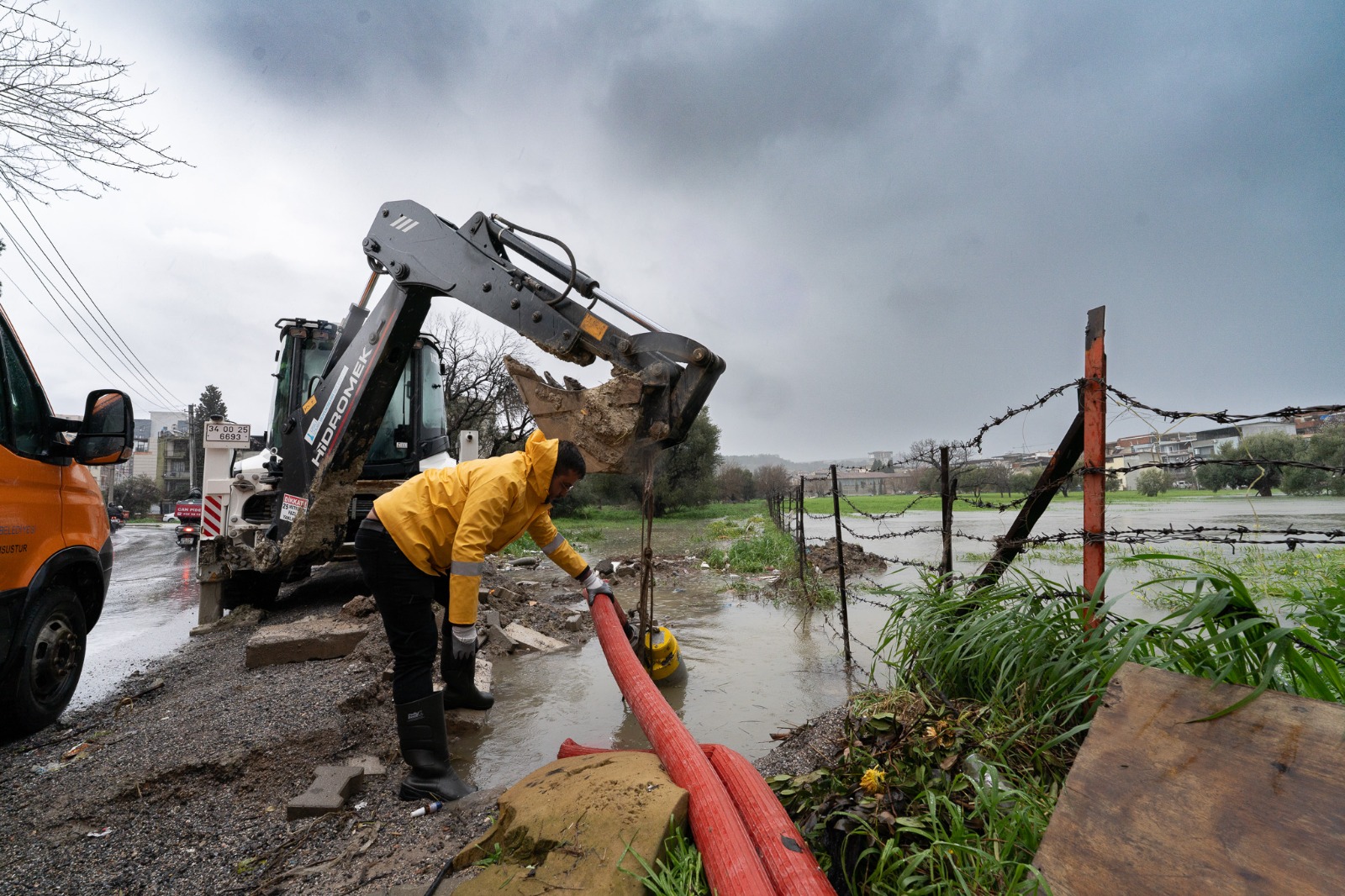 İzmir Büyükşehir Belediyesi ekipleri İzmir’de dün gece başlayan ve sabaha kadar aralıklarla etkisini sürdüren kuvvetli yağış nedeniyle oluşan su baskınları, heyelan ve taşkınlara müdahalesini sürdürüyor. Meteoroloji Genel Müdürlüğü verilerine göre son 12 saat içinde en fazla yağış Aliağa’da metrekareye 45,8 kilogram, Karaburun’da 42,3 kilogram ölçüldü. İzmir Büyükşehir Belediyesi’ne bağlı birimler gelen ihbarlara anında müdahale etti.