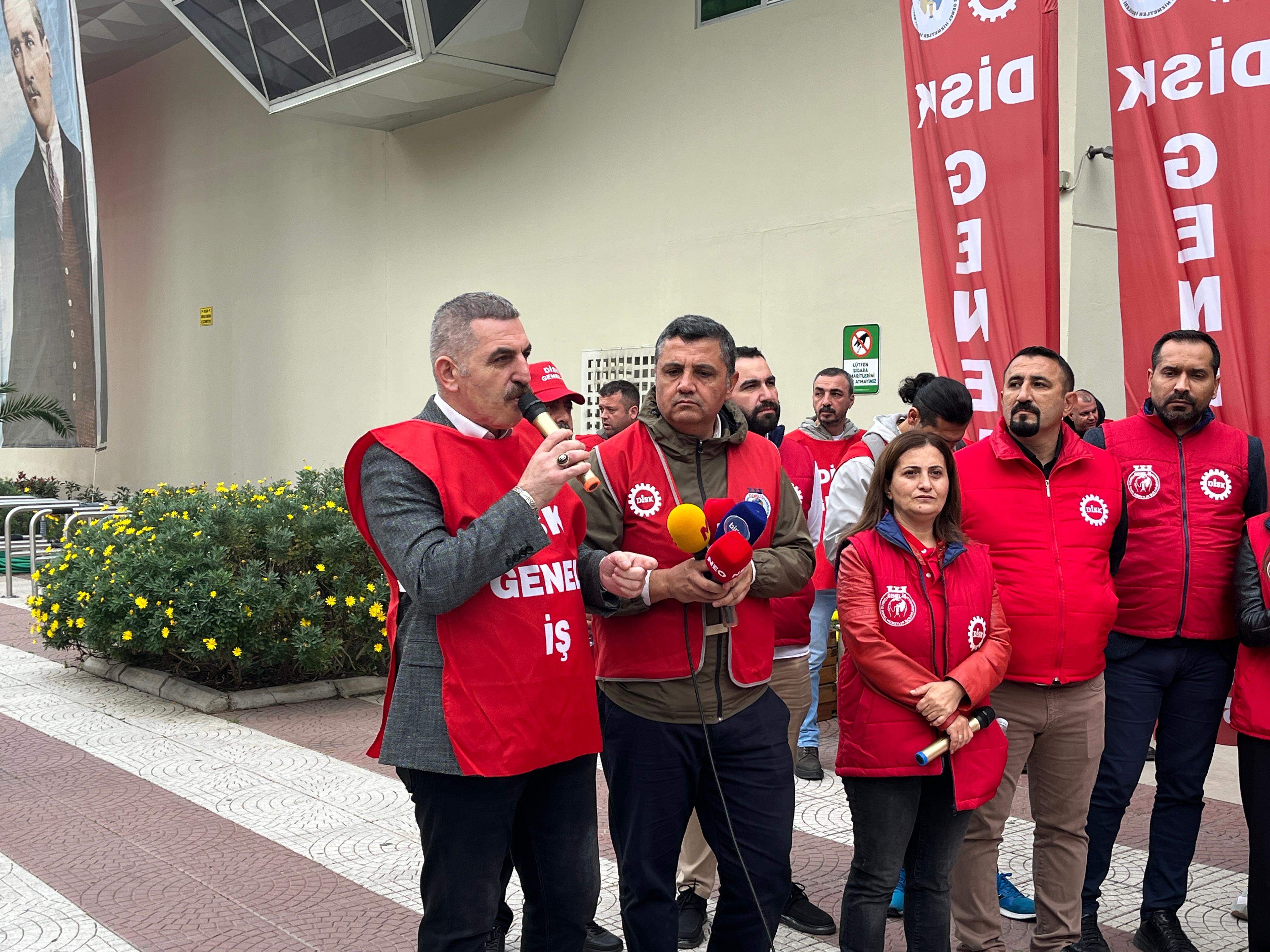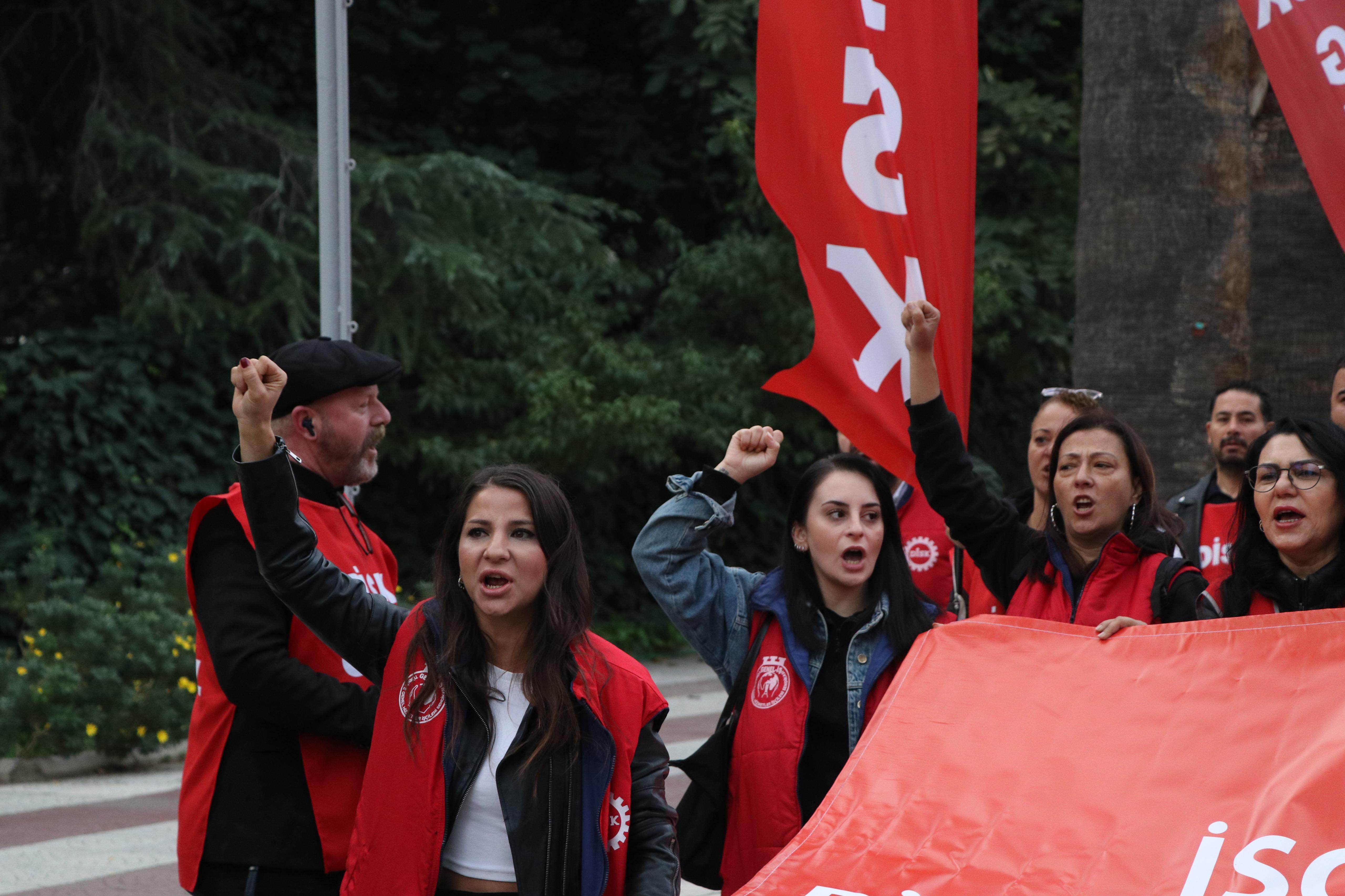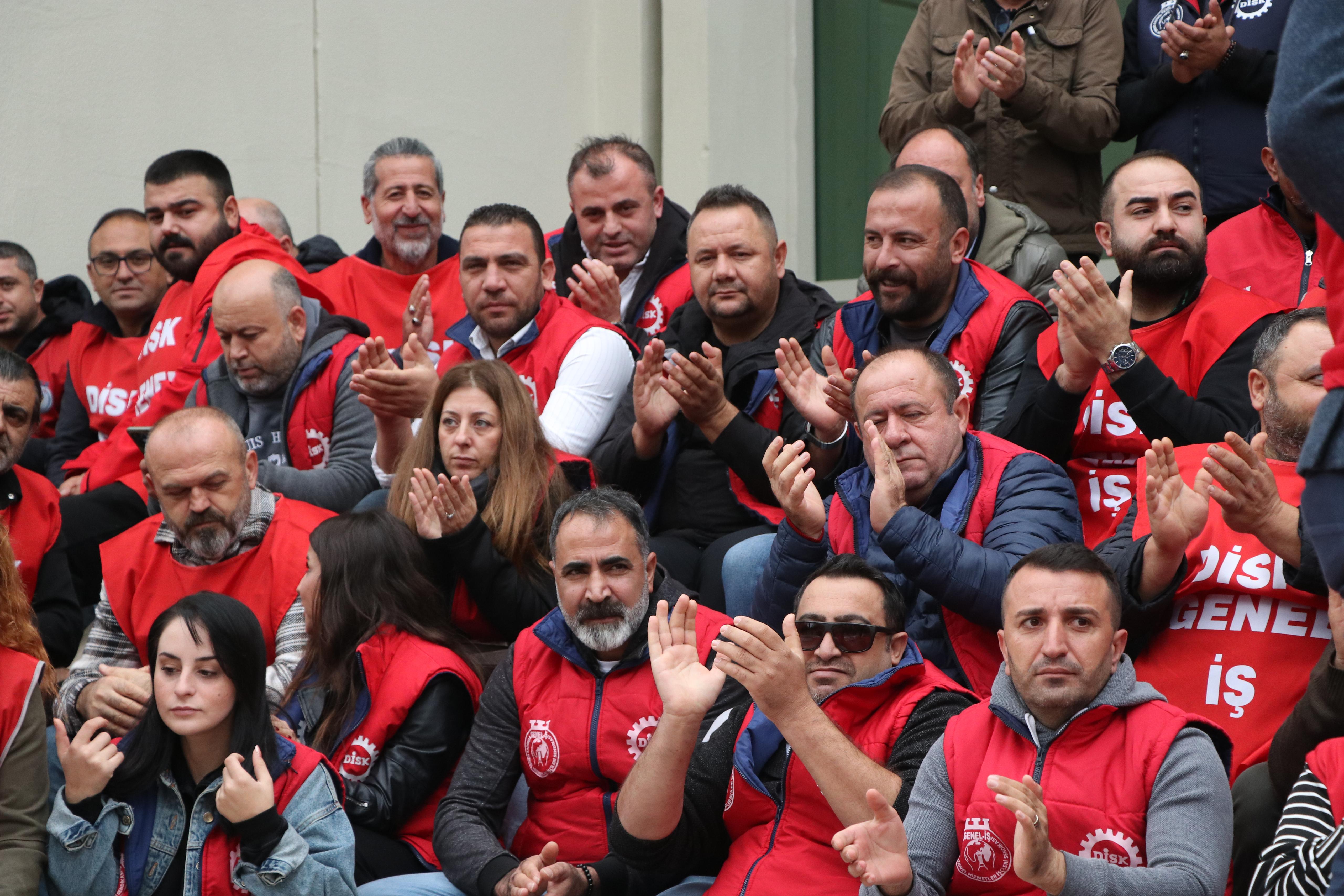 Kültürpark 1 No'lu Hol önünde toplanan DİSK'e bağlı Genel İş sendikasında örgütlü işçiler "Bu daha başlagıç mücadeleye devam", "İş, ekmek yoksa barış da yok" sloganları attı.