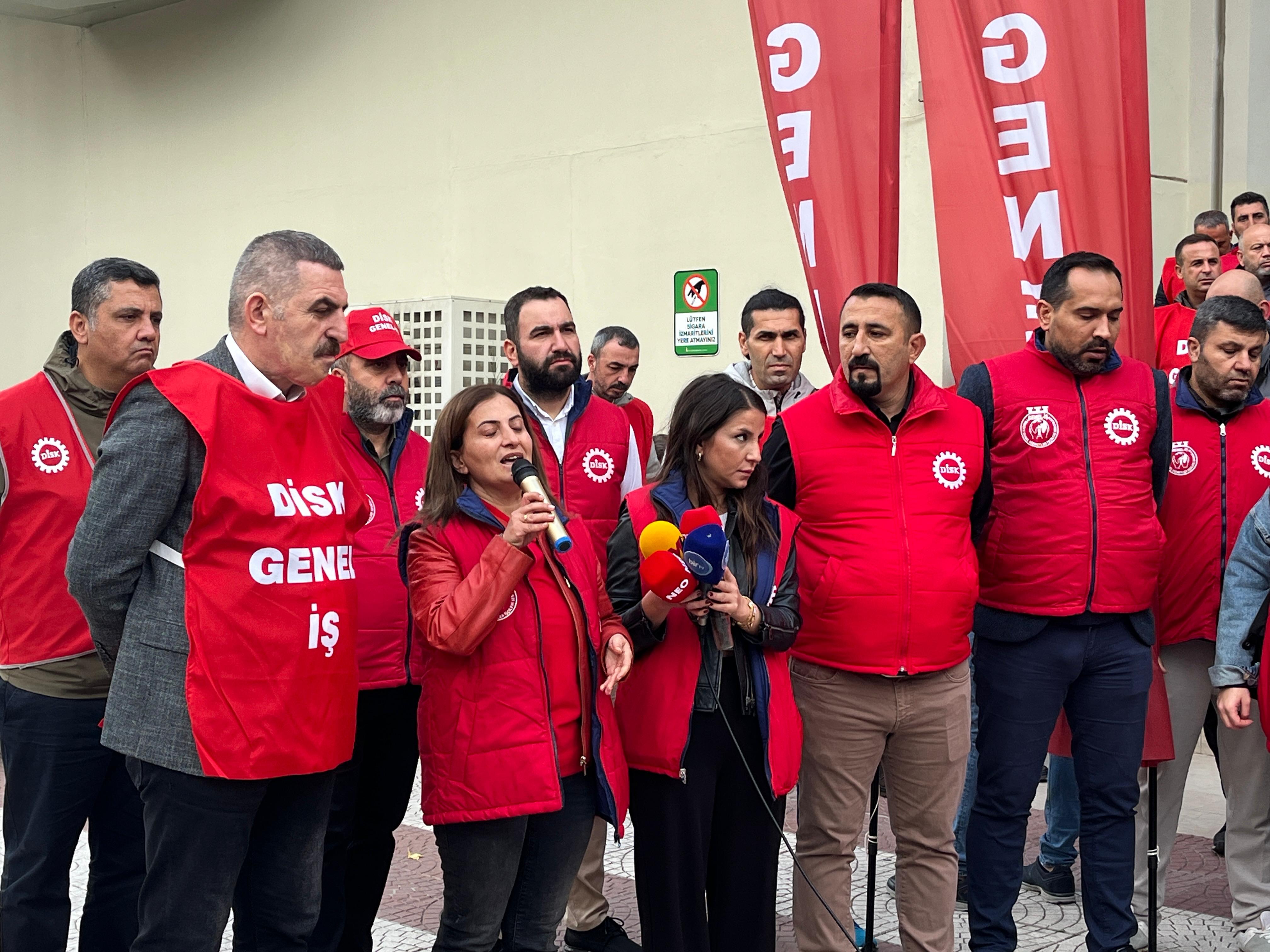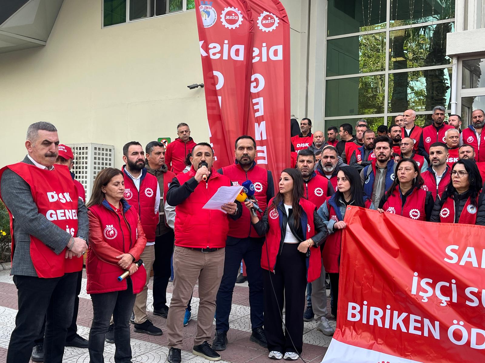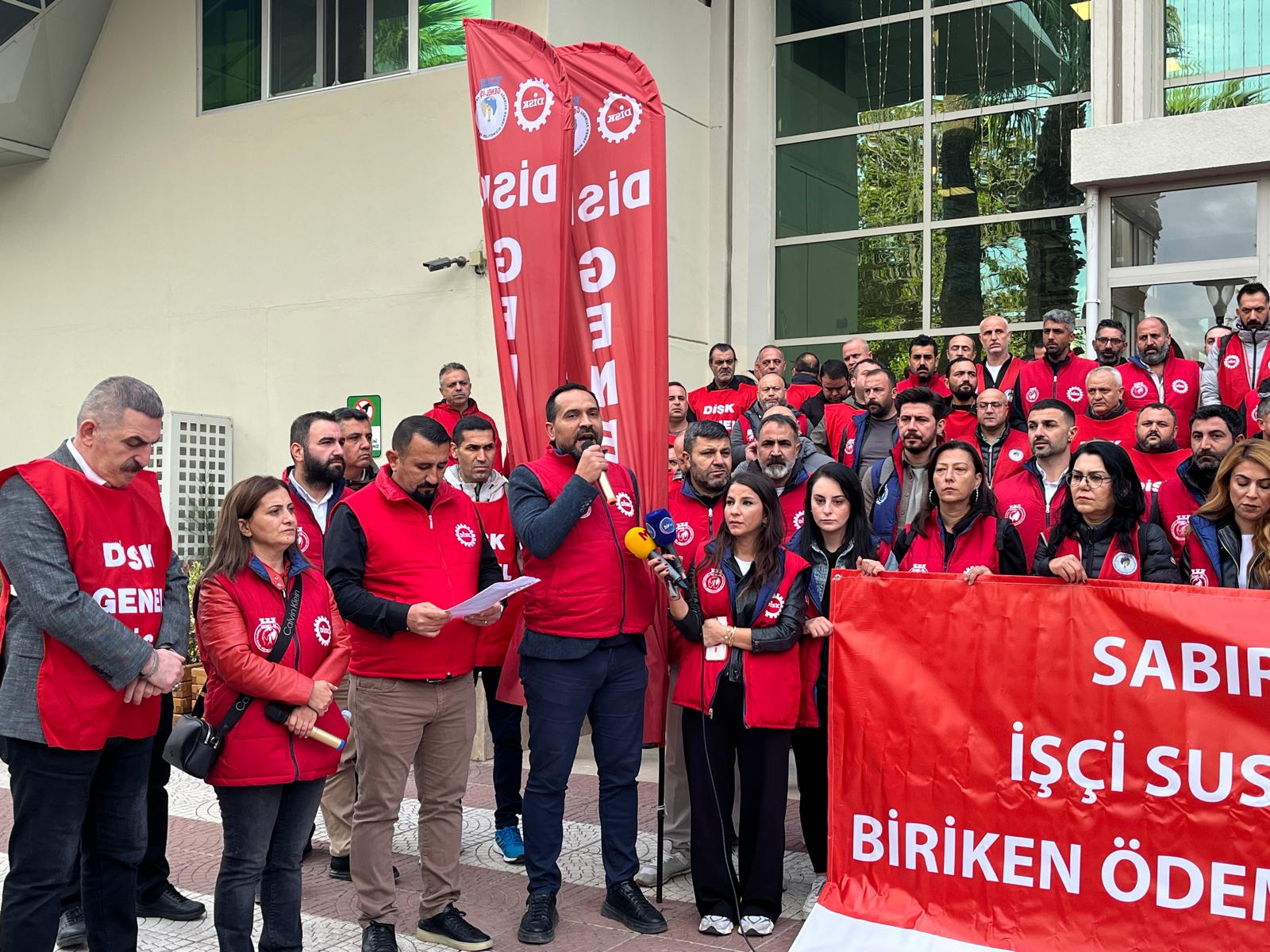 Kültürpark 1 No'lu Hol önünde toplanan DİSK'e bağlı Genel İş sendikasında örgütlü işçiler "Bu daha başlagıç mücadeleye devam", "İş, ekmek yoksa barış da yok" sloganları attı.