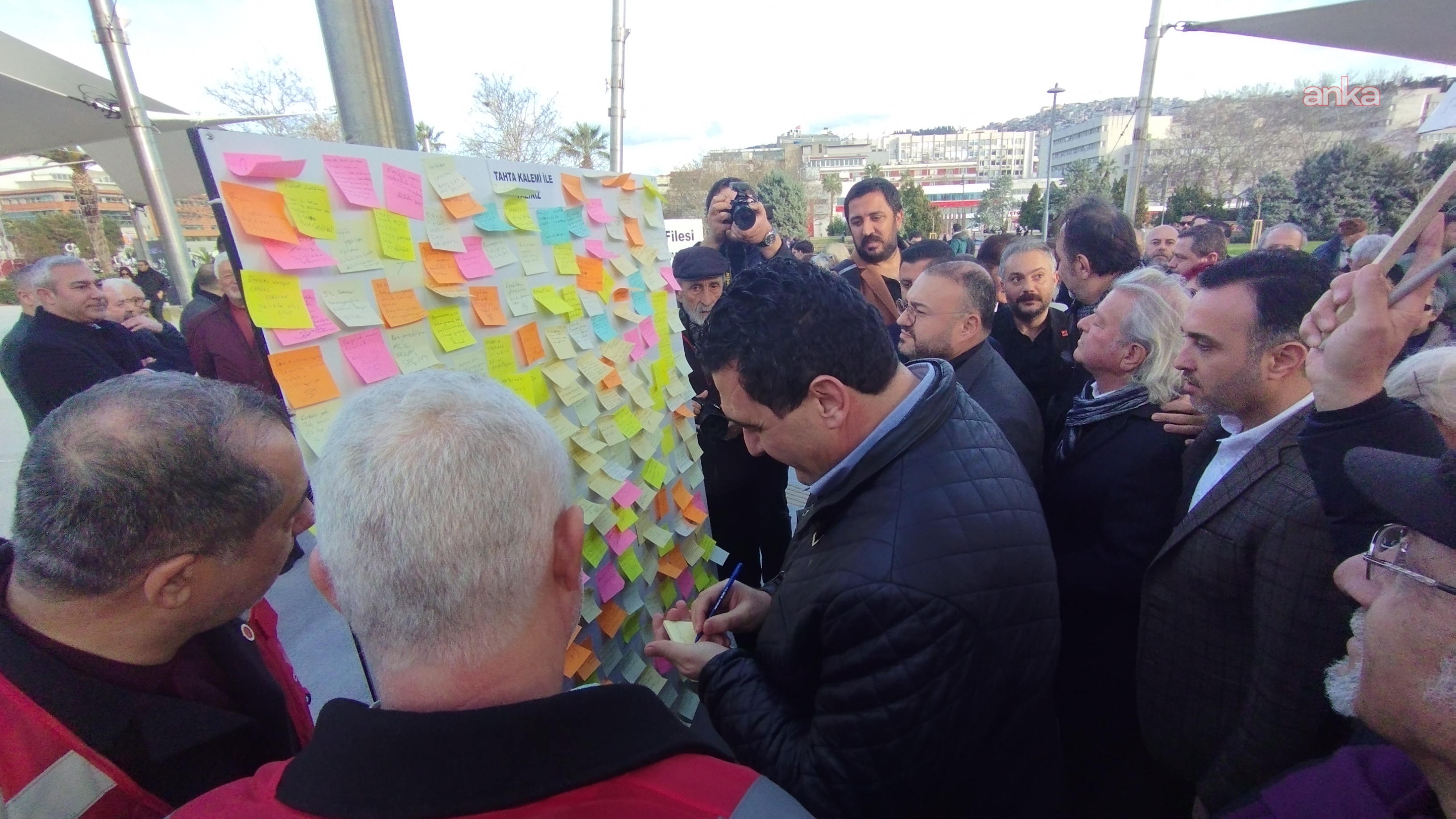 Nazar boncuğu desenli poşette bulunan ve gün boyunca emeklilerin yazarak tahtaya astığı notların bazıları kürsüden okundu. (ANKA)