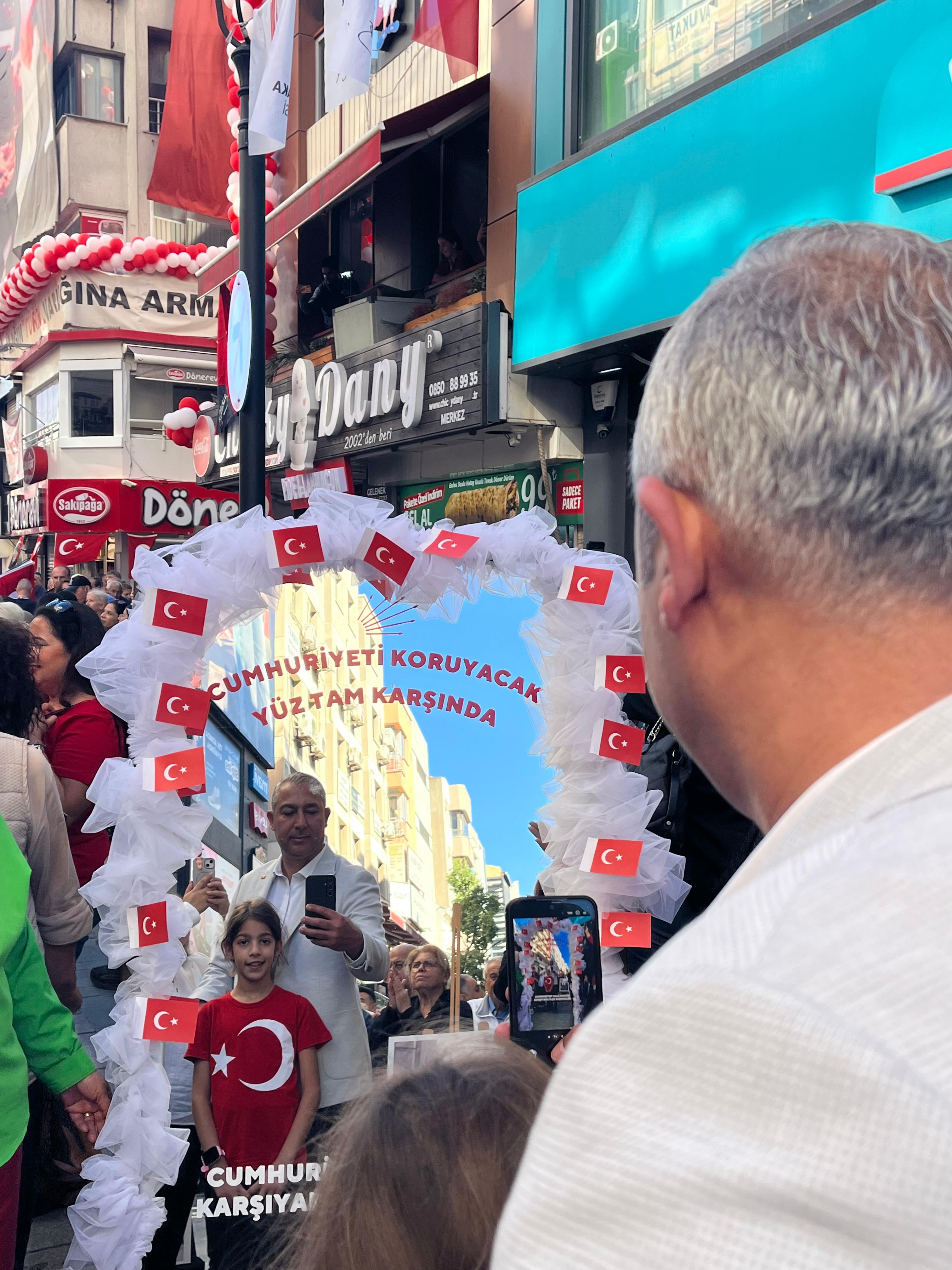 GERÇEKİZMİR - Cumhuriyet’in 102. yılı kutlamaları kapsamında CHP Karşıyaka İlçe Başkanlığı, Karşıyaka Çarşı’daki ilçe binası önünde özel bir etkinliğe imza attı. Karşıyakalılarının yoğun katılım gösterdiği etkinlikte, “Cumhuriyeti koruyacak yüz tam karşında” yazılı selfie aynası büyük ilgi gördü.