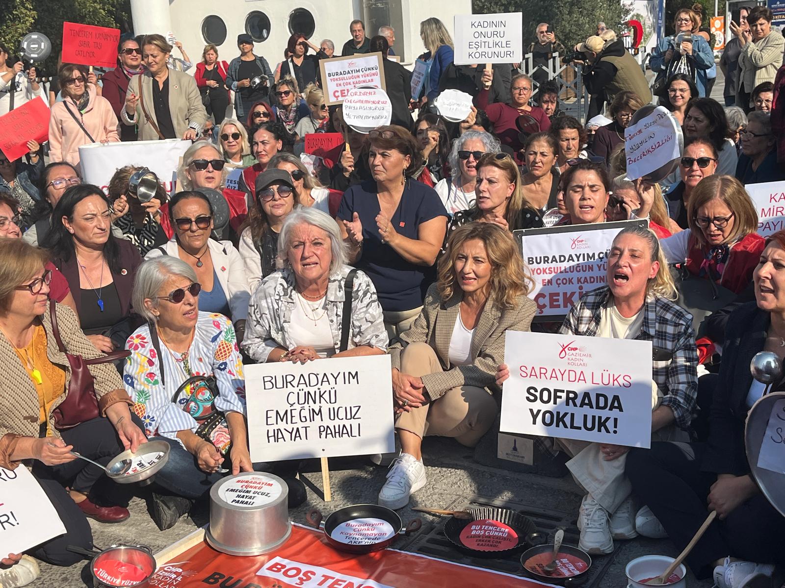 Asena TUNCA/GERÇEKİZMİR- CHP Kadın Kolları 17 Ekim Dünya Yoksullukla Mücadele Günü kapsamında 'geçinemiyoruz' diyerek tencere tavalı eylem yaptı.