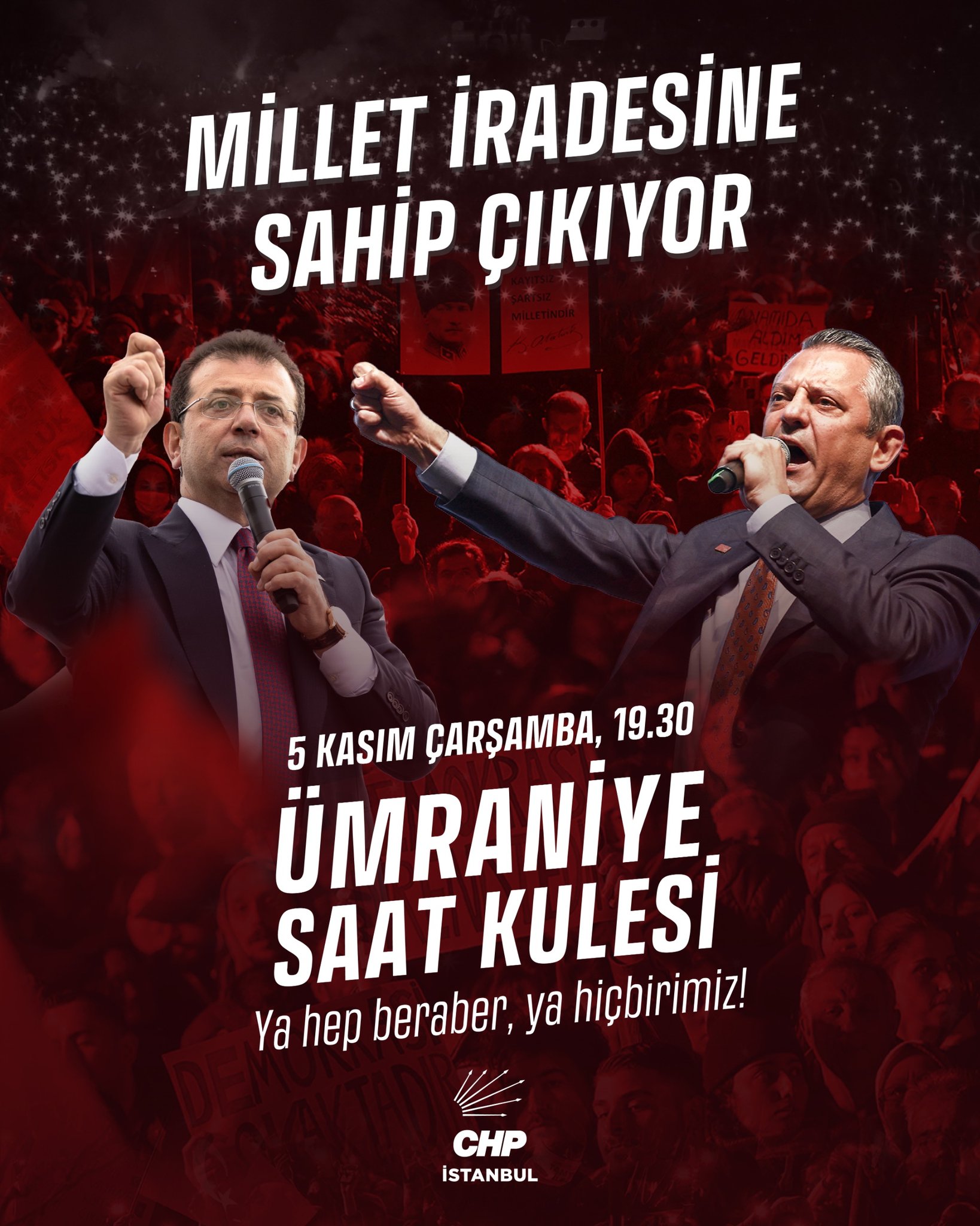 CHP İl Başkanlığı tarafından yapılan açıklamada, "İrademiz ve geleceğimiz için mücadele ediyoruz. Genel Başkanımız Özgür Özel öncülüğünde, Cumhurbaşkanı adayımız Ekrem İmamoğlu ve tüm yol arkadaşlarımıza özgürlük demek için buluşuyoruz" denildi.