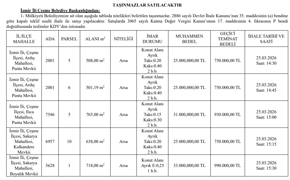 Çeşme Belediyesi mülkiyetinde bulunan 5 taşınmazı satma kararı aldı. Belediye taşınmaz satışlarından toplamda 139 milyon TL gelir elde etmeyi planlıyor.