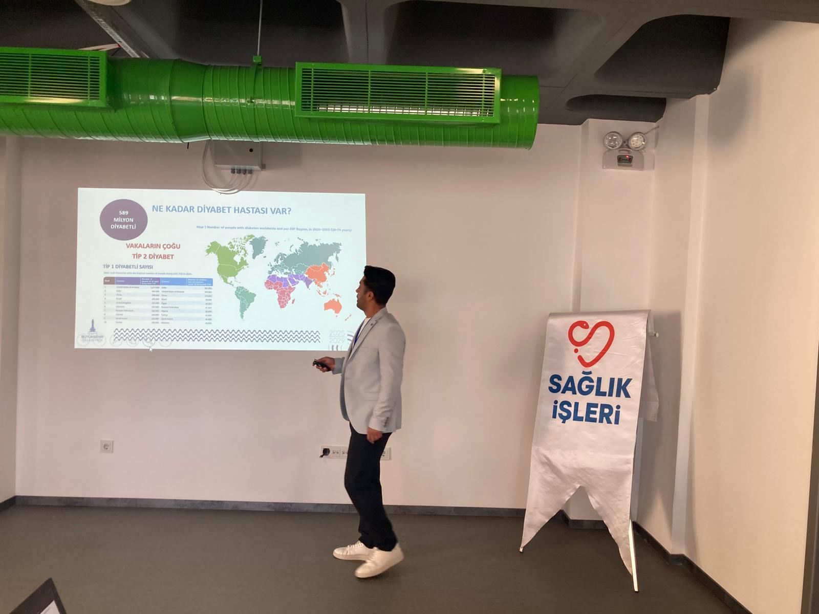 İZSEM’de düzenlenen eğitimde ise Sağlık Eğitimleri Şube Müdürlüğü’nde görevli Diyetisyen Emre Turhan, diyabet farkındalığını artırmak ve diyabet eğitimini yaygınlaştırmak için köy köy, mahalle mahalle diyabet farkındalığı eğitimleri düzenlediklerini belirtti. Turhan, “Bu eğitimlerde diyabetin nasıl bir hastalık olduğu, diyabette beslenme, fiziksel aktivite ve öz bakımın önemini anlatıyoruz. Şeker hastalarının en büyük korkularından birisi de ‘yediklerimiz kan şekerimi yükseltir mi?’ korkusudur. Bu noktada diyabet hastalarının özellikle karbonhidratlardan korkmamaları gerekir. Burada önemli olan kan şekerini yavaş yükselten kompleks karbonhidratları tüketmektir. Kompleks karbonhidratlar tam tahıllar, kuru baklagiller, sebzeler ve meyvelerde bulunur. Yüksek şeker zarar verir, düşük şeker öldürür. Bu nedenle şeker hastalarının hipoglisemi tehlikesine karşın mutlaka yanlarında kan şekerini hızlı artıracak karbonhidratları taşımaları ve ara öğün yapmaları çok önemlidir. Yine kan şekeri ölçümü yapmak hayat kurtarır. Beslenmenin düzenlenmesi için bir diyabet diyetisyenine gidilmesinin yanı sıra hekimin verdiği ilaçları düzenli kullanmak ve düzenli hekim kontrolüne gitmek de çok önemlidir” dedi.