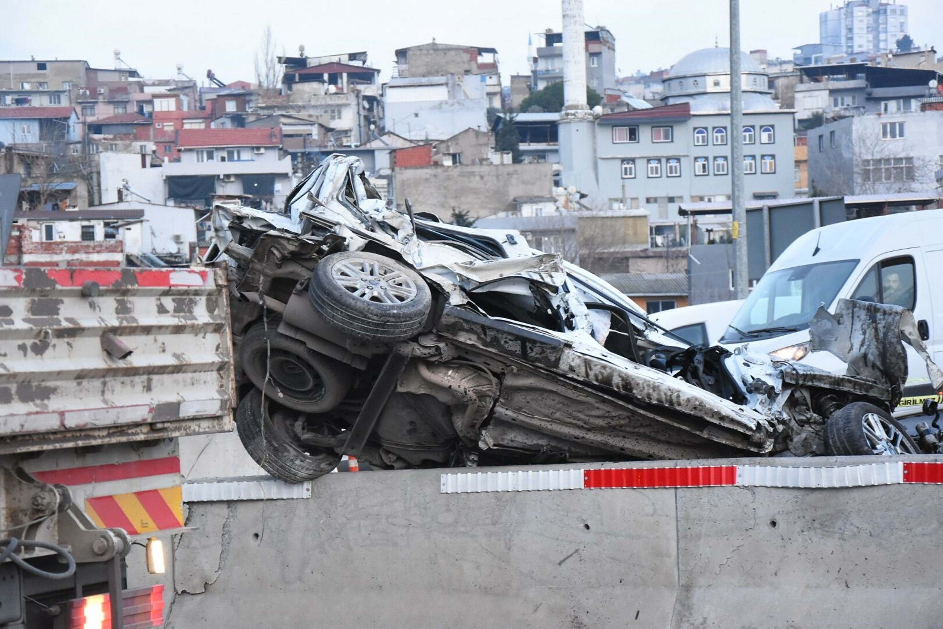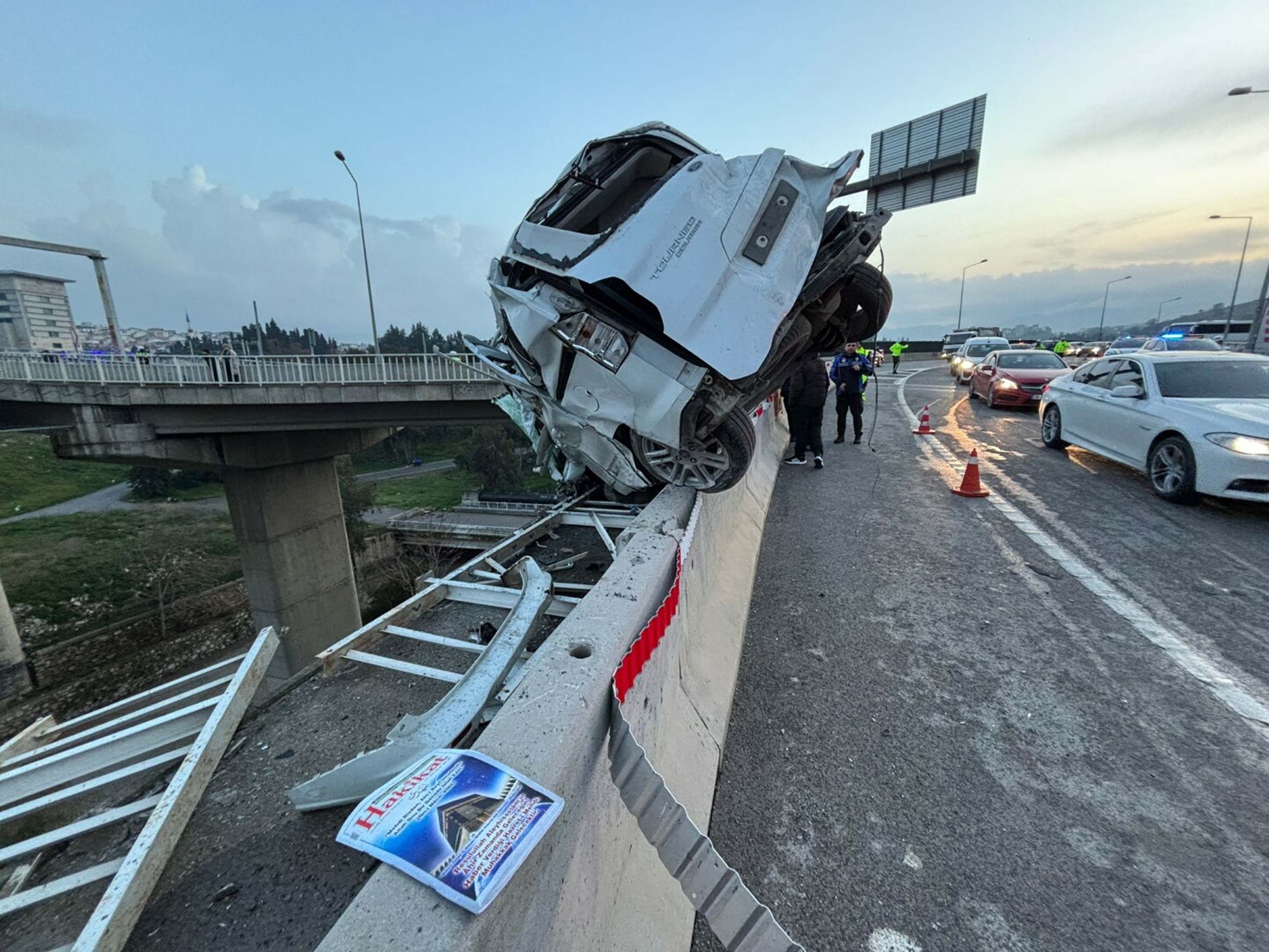Hafif ticari araç ise viyadüğü bariyerlerinde asılı kaldı. Çevredekilerin ihbarı üzerine kaza yerine sağlık, itfaiye ve polis ekipleri sevk edildi. Hafif ticari araçta sıkışan sürücü Kasap ve yolcu konumundaki Bahaddin Erden (19) ile TIR şoförü Şimşek, itfaiye ekipleri tarafından bulundukları yerden çıkarıldı.