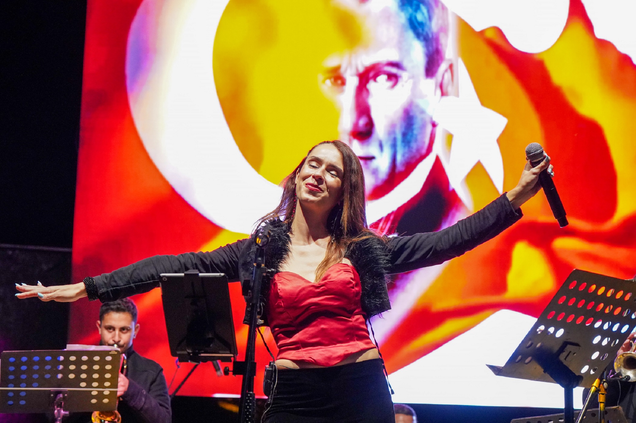 Ellerinde Türk bayraklarıyla yürüyen vatandaşlar, caddeleri adeta gelincik tarlasına çevirdi. Kortej güzergâhındaki evlerinden alkışlarla destek veren yurttaşlar, coşkuya ortak oldu. Dev Türk Bayrağı ve Atatürk posteriyle ilerleyen kortej, marşlar ve şarkılar eşliğinde Festival Alanı’na ulaştı. Bayram coşkusu, burada düzenlenen Merve Mete konseriyle devam etti. Alanı dolduran binlerce kişi, genç sanatçının seslendirdiği şarkılara eşlik ederek Cumhuriyet’in 102. yılını kutladı. Gaziemir Belediyesi Halk Dansları Topluluğu da sahnelediği harmandalı gösterisiyle geceye renk kattı. Kutlama etkinliğinde sahne alan Arda Ayva da rap performansıyla seyirciye bayram coşkusu yaşattı.