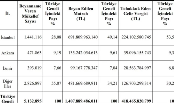 Türkiye'nin ekonomik haritasını çıkaran vergi rekortmenleri listesi, ülkenin finansal ağırlık merkezini net bir şekilde ortaya koydu. İstanbul, Ankara ve İzmir; hem mükellef sayısı, hem beyan edilen matrah hem de tahakkuk eden gelir vergisi miktarı açısından açık ara en büyük paya sahip olan iller oldu.