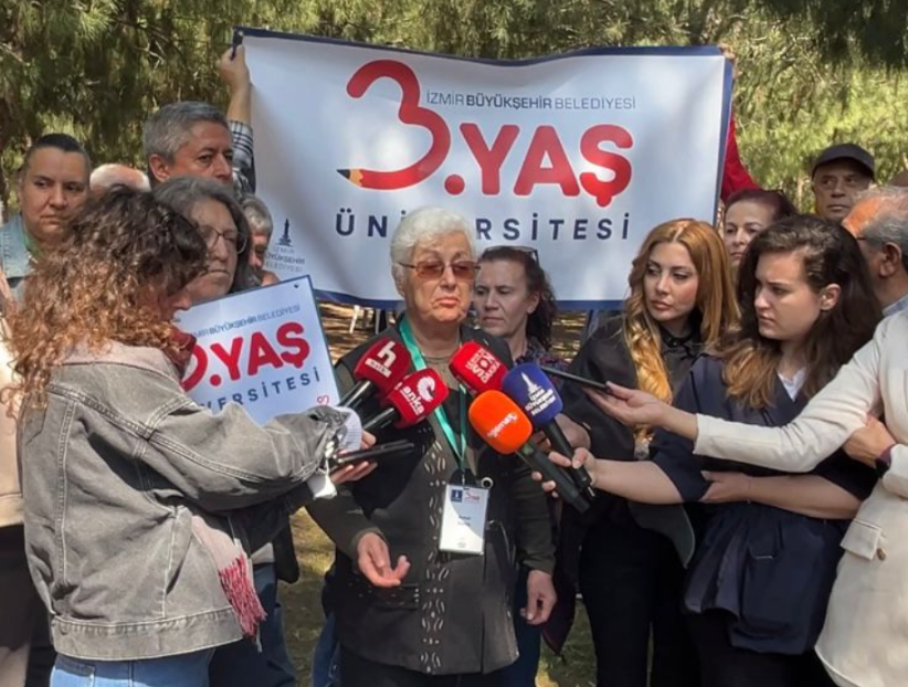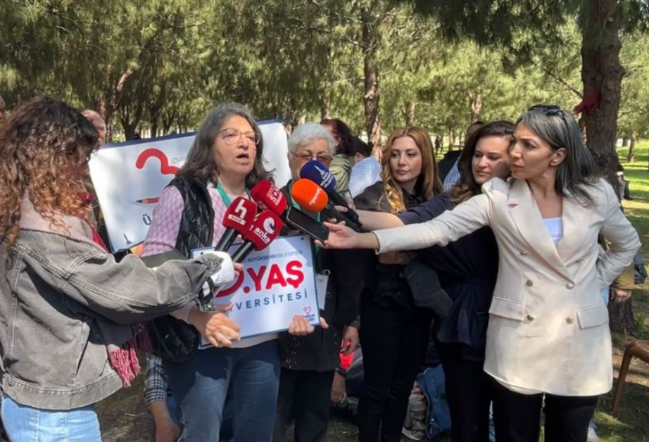 60 yaş üstü gruptan Ayşe Tetik, “Dersliğimiz karşınızda gördüğünüz Meslek Fabrikası. Orada binlerce genç de ders görüyor, biz de ders görüyoruz. Ve dershanemizin, okulumuzun el konulmasına karşı çıkıyoruz. Şu anda biz o dershanede ders görüyor olacaktık. Bakın bize psikolojik, sosyolojik, sağlık, mutfak sanatları, hobi derslerimiz, Türk Sanat Müziği, Türk Halk Müziği, halk oyunları... Yani belli bir yaştan sonra hayattan kopmak değil, hayatın içinde olmayı öğretiyorlar” şeklinde konuştu.