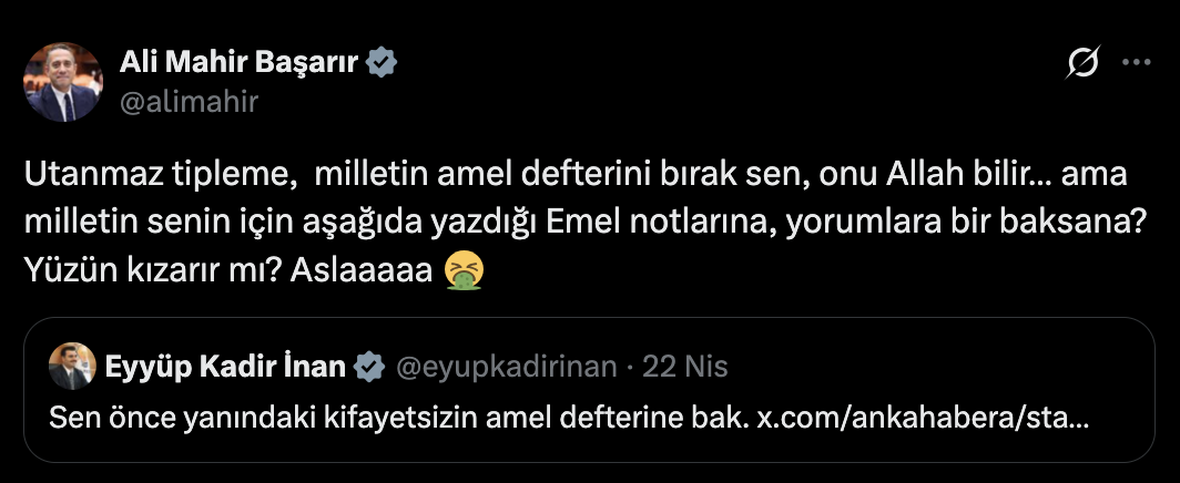 GERÇEKİZMİR - AK Parti Genel Başkan Yardımcısı Eyüp Kadir İnan ile CHP Grup Başkan Vekili Ali Mahir Başarır arasında sosyal medyada başlayan “amel defteri” tartışması karşılıklı sert ifadelerle devam etti. Polemik, CHP Genel Başkanı Özgür Özel’in bir konuşmasının yer aldığı video üzerinden başladı.