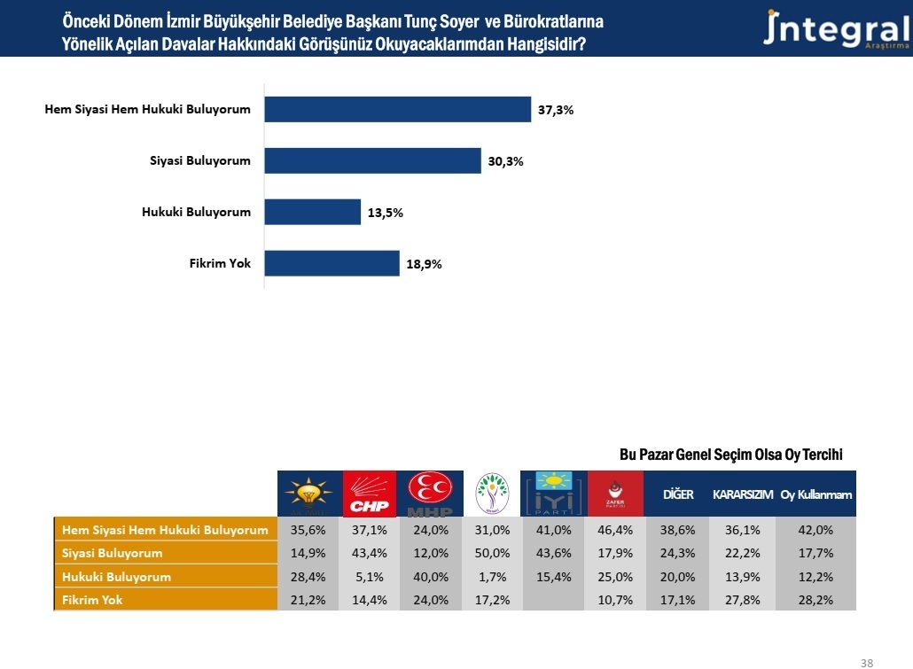 Ankete katılan İzmirlilerin yüzde 37,3’ü davalar hakkında ‘Hem siyasi hem hukuki buluyorum’ görüşünü belirtti.