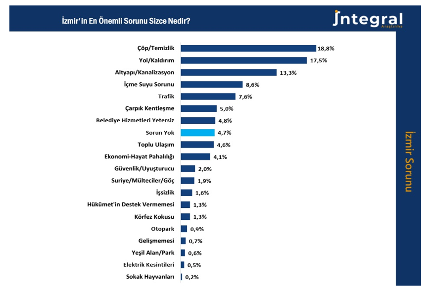 İntegral Araştırma İzmir’in sorunları başlıklı açıklamasında kentin en önemli sorunlarına yönelik analizi paylaştı. Buna göre, İzmirliler kendilerine açık uçlu olarak yöneltilen “İzmir’in en önemli sorunu nedir?” sorusuna 19 farklı başlıkta yanıt verdi. Listenin başında temizlik, yol kaldırım sorunları yer aldı. İfade edilen sorunların %84’ünün doğrudan belediye temel belediye hizmetlerine yönelik cevaplardan oluştuğu saptanırken, %12’sinin hayat pahalılığı, işsizlik, mülteci-göç sorunu, uyuşturucu-güvenlik gibi daha çok merkezi hükümetin yetki alanındaki sorunlardan oluştuğu gözlendi.