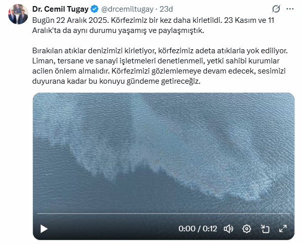İZSU’nun Körfez’de yürüttüğü dip tarama ve temizlik çalışmaları devam ederken denize atık bırakıldığı görüntüler ortaya çıktı. İzmir Büyükşehir Belediye Başkanı Cemil Tugay, sosyal medya hesabından tepki gösterirken, "Liman, tersane ve sanayi işletmeleri denetlenmeli, yetki sahibi kurumlar acilen önlem almalıdır" çağrısı yaptı.