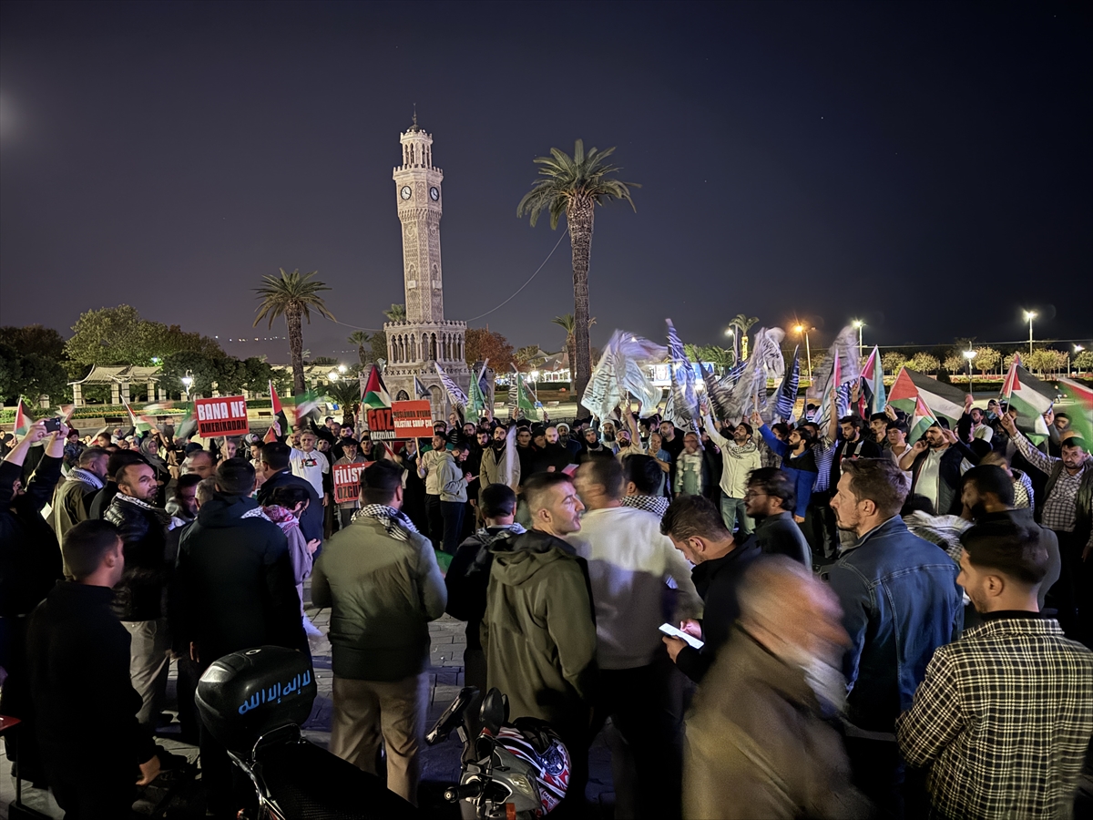 İzmir'de Konak Meydanı'ndan toplanan çok sayıda kişi, İsrail aleyhine slogan attı. Ellerindeki Türk ve Filistin bayrakları ile çeşitli pankartlar taşıyan vatandaşlar, tekbir getirdi.