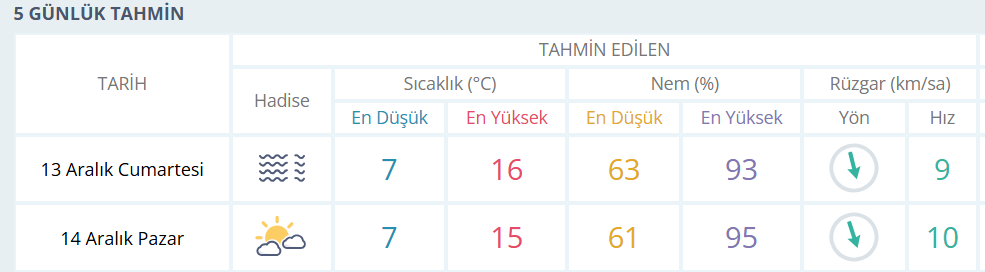 Pazar günü ise hava sıcaklığı 15 derece olacak. Yağmur yağışı beklenmiyor. Gökyüzü parçalı bulutlu olacak.