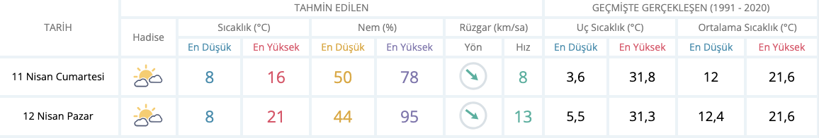 12 Nisan Pazar günü ise sıcaklıklar artış gösteriyor. En düşük 8, en yüksek 21 derece ölçülmesi beklenirken nem oranı yüzde 44 ile 95 arasında değişecek. Rüzgar hızının ise saatte 13 kilometreye kadar çıkacağı tahmin ediliyor.