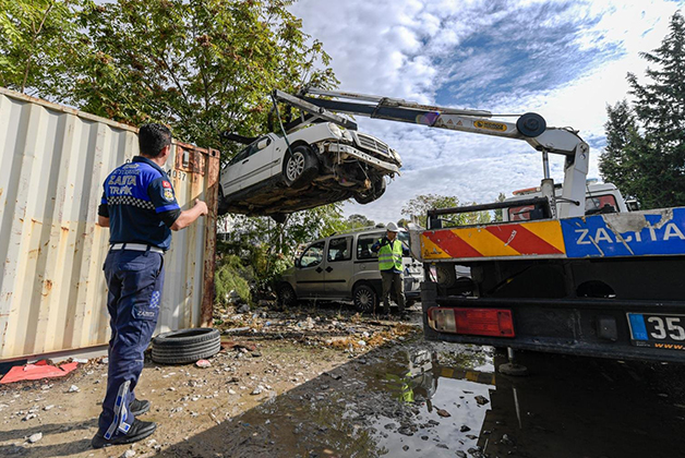 İzmir Büyükşehir Belediyesi Zabıta Dairesi Başkanlığı, kent genelinde trafik akışını engelleyen, güvenlik sorunu yaratan, görüntü ve çevre kirliliği oluşturan terk edilmiş hurda araçlara yönelik çalışmalarını sürdürüyor. Kamuya açık alanlara terk edilen hurda araçlar, Menemen’in Kazımpaşa Mahallesi’nde toplam 18 dönüm alan üzerine kurulu Hurda Araç Merkezi’ne getiriliyor. Ekipler, İzmir genelinde bulunan 12 oto sanayi sitesinin yanı sıra mahalle ile sokak aralarına terk edilen otomobilleri kaldırıyor. Hurda Araç Merkezi’ne hakkında çalıntı işlemi veya yakalama kararı bulunan araçlar alınmıyor. 6 ay içerisinde merkezden alınmayan araçlar, ilgili kamu kurumları tarafından ekonomiye kazandırılıyor.