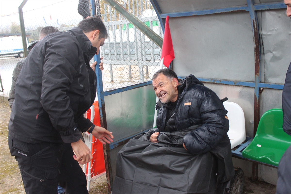 Maçı saha kenarındaki kulübeden izleyen Nevzat Kahyaoğlu (48) maç sırasında yağışın etkisini artırması üzerine ıslanmaya başladı.