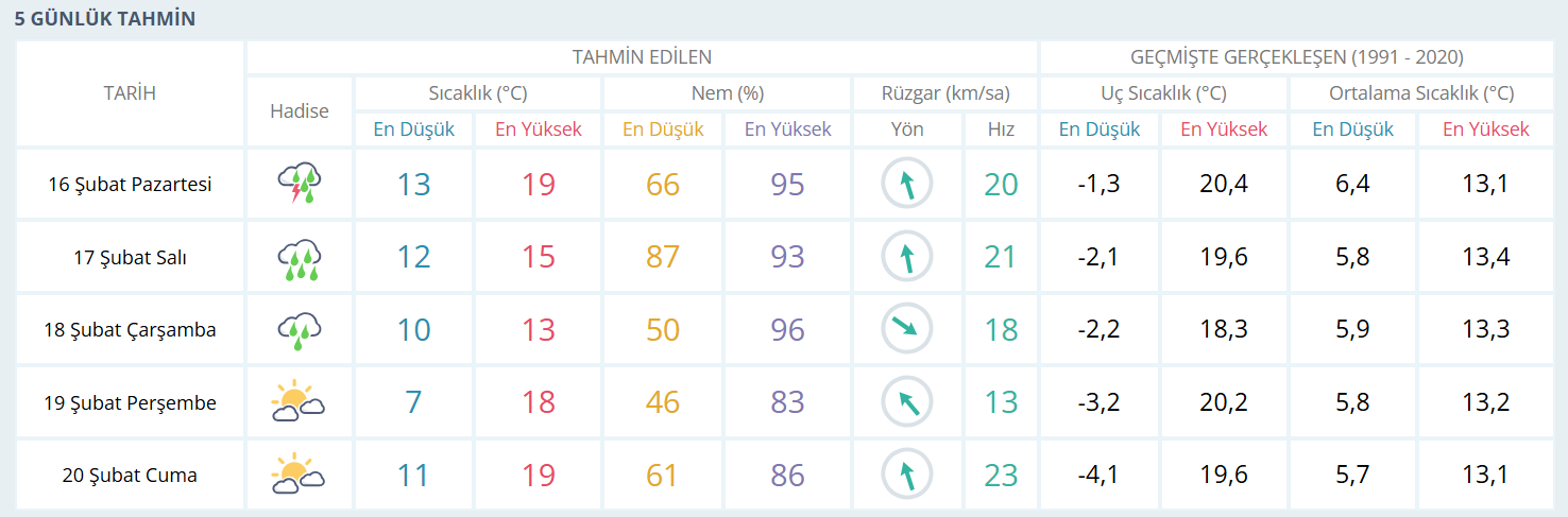 Kentte perşembe ve cuma günleri yağışlara kısa bir mola verilecek. Hava sıcaklığı 18 ve 19 derece olacak. Perşembe günü gece sıcaklığı 7 dereceye kadar düşecek.