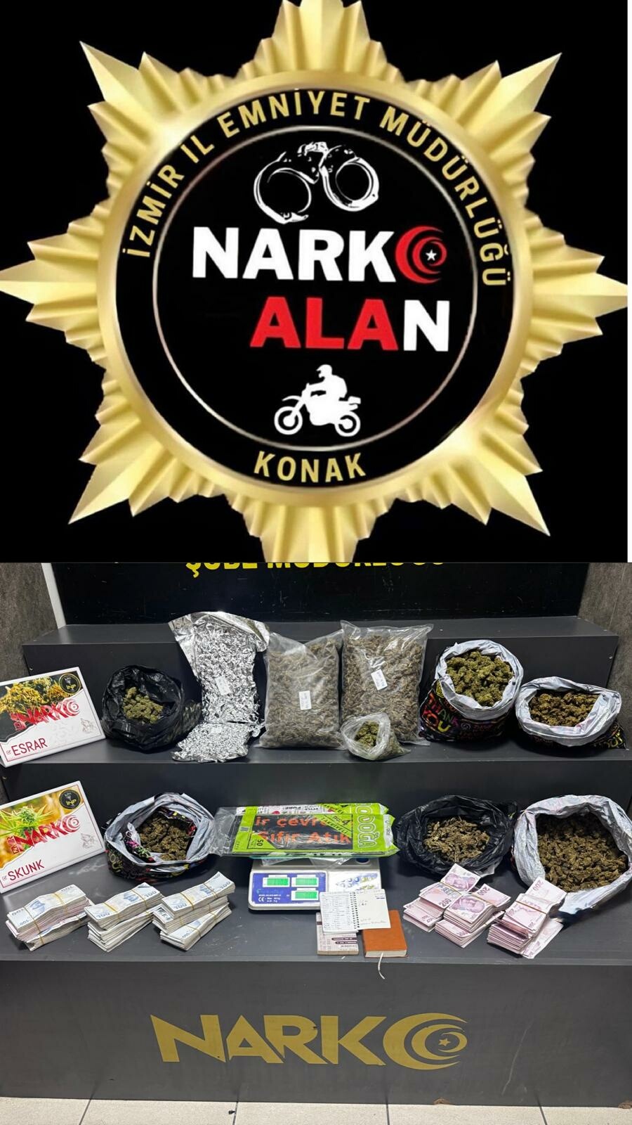Konak İlçe Emniyet Müdürlüğü ile Narkotik Suçlarla Mücadele Şube Müdürlüğü personelinden oluşan Narko Alan ekipleri, ilçede uyuşturucu ticaretine yönelik yürütülen çalışmalar kapsamında belirlenen adreslere operasyon düzenledi. Adreslerde yapılan aramalarda 8 kilo skunk maddesi, 200 gram metamfetamin, 180 sentetik ecza, 3 hassas terazi, 2 ruhsatsız tabanca, 5 fişek ve 371 bin 500 lira nakit para ele geçirildi.