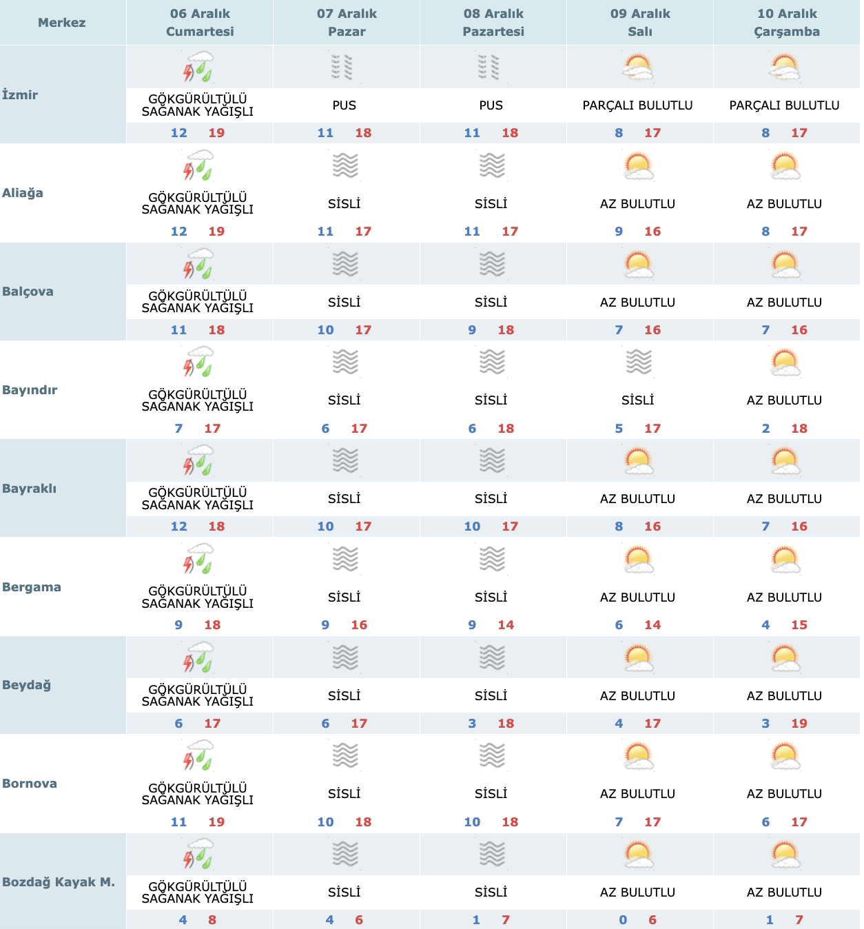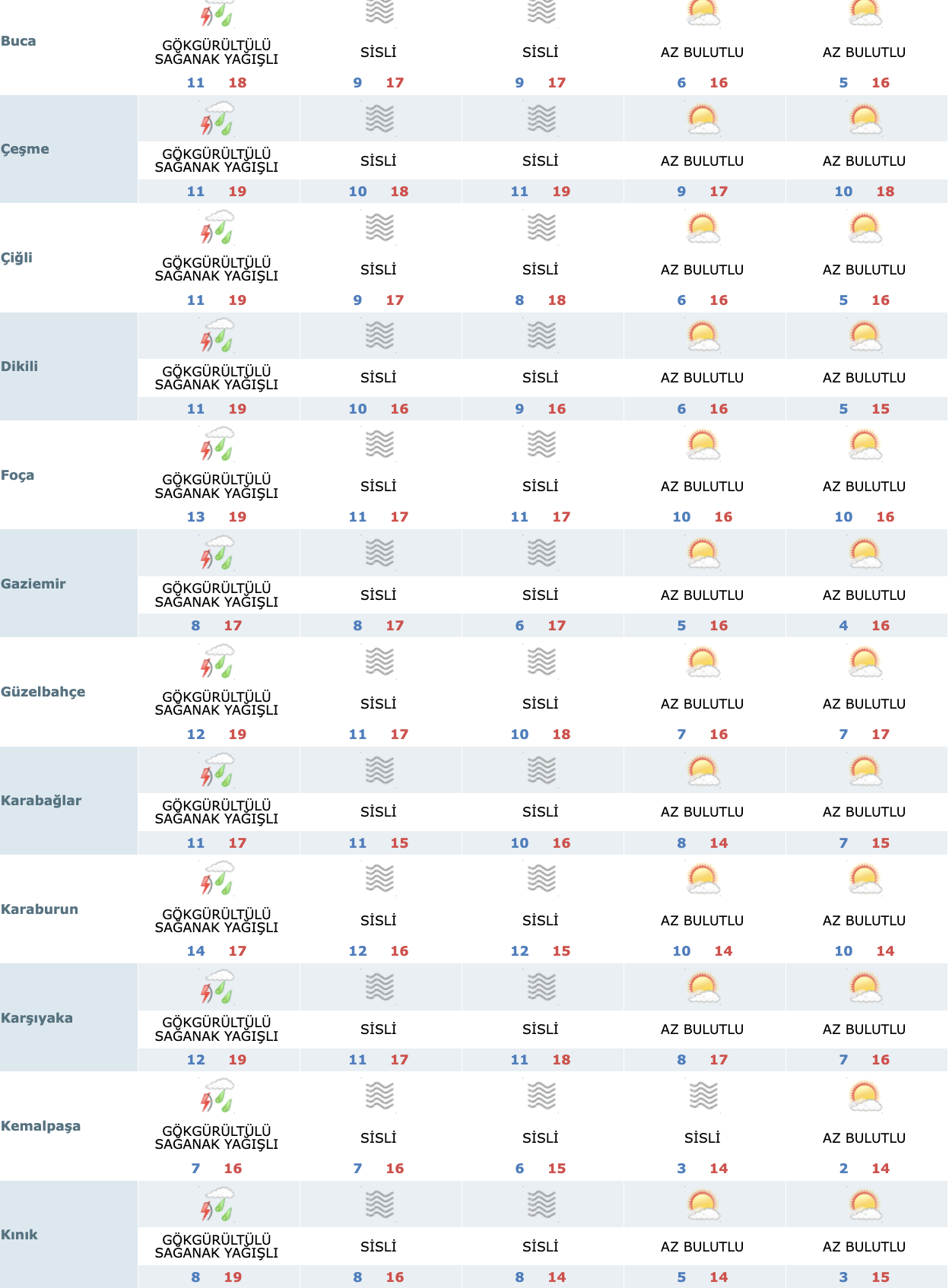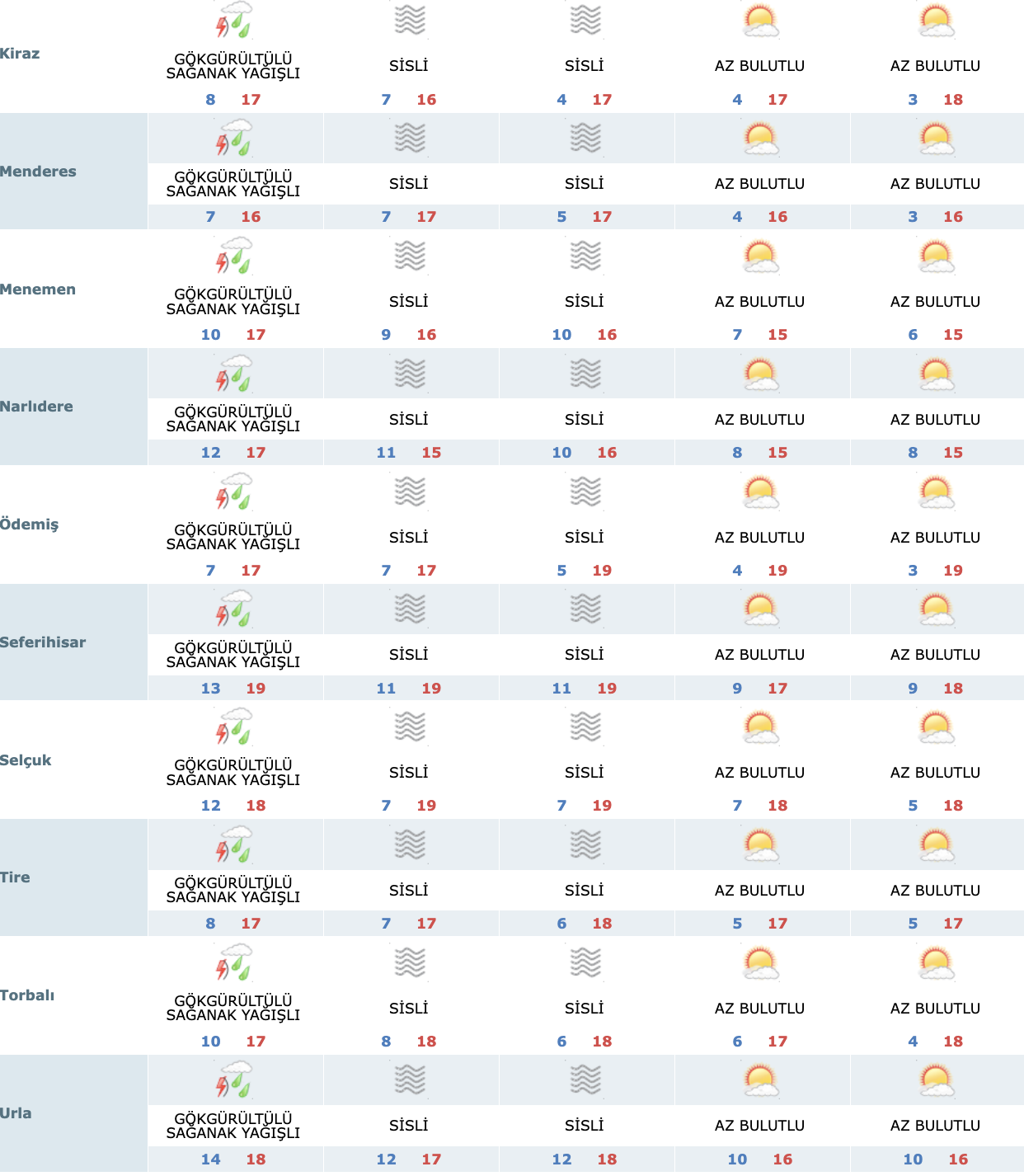 Hava sıcaklığının 12–19 derece arasında seyredeceği kentte, ani sel ve su baskınlarına karşı uyarı yapıldı. Yıldırım, yerel dolu geçişleri, kıyı kesimlerde hortum olasılığı ve yağış anında kuvvetli rüzgar beklendiği belirtildi. Çeşme, Foça, Seferihisar, Urla ve Karaburun’da yağışların daha kuvvetli görülebileceği bildirildi.