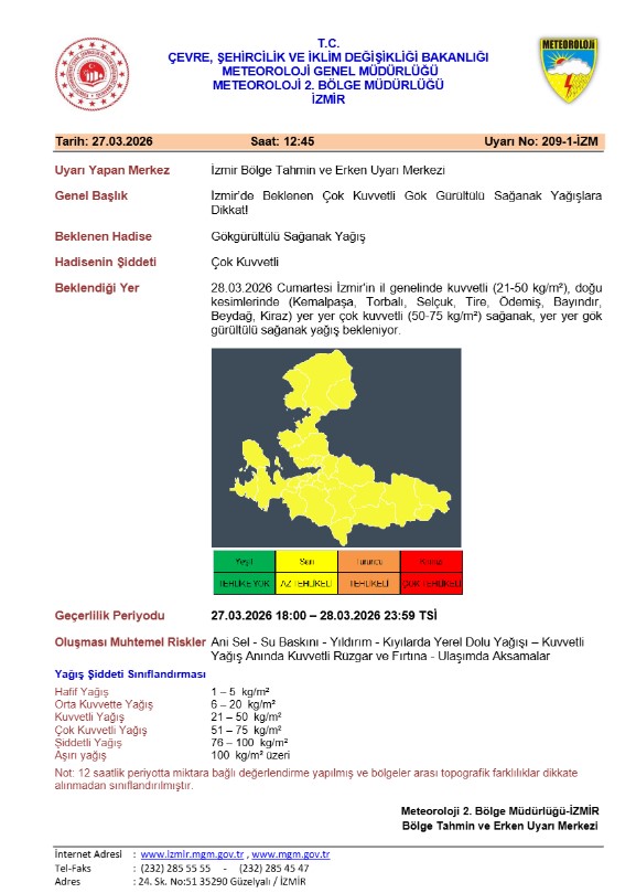 Meteoroloji yetkililerinin değerlendirmelerine göre, İzmir genelinde sağanak ve gök gürültülü sağanak yağış bu akşam saatlerinden itibaren etkili olacak. Yağışların 28 Mart Cumartesi günü saat 23.59’a kadar aralıklarla devam edeceği tahmin ediliyor.
