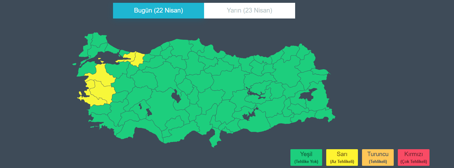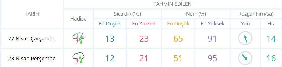 Rüzgarın ise; genellikle güney, güneybatı, Marmara, Kuzey Ege ve Batı Karadeniz'de kuzey ve kuzeydoğu yönlerden hafif, ara sıra orta kuvvette Marmara, Kuzey Ege ve Batı Karadeniz'de yer yer kuvvetli (40-60 km/sa) esmesi bekleniyor.
