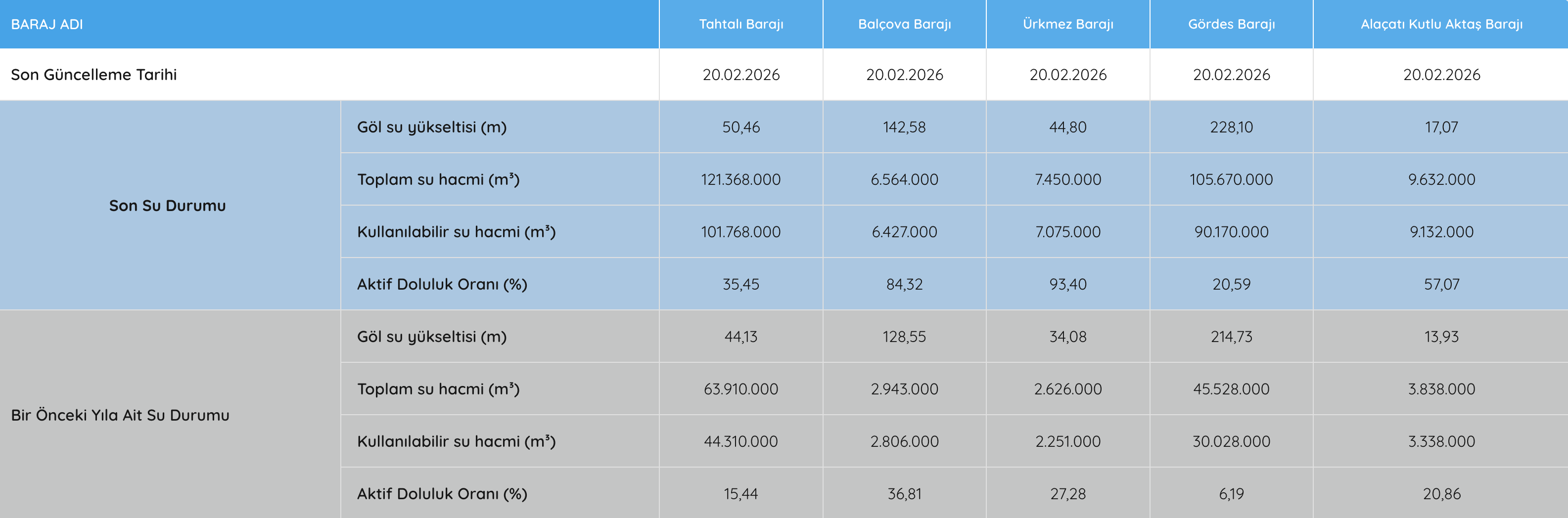(20 Şubat 2026 Barajların Durumu)