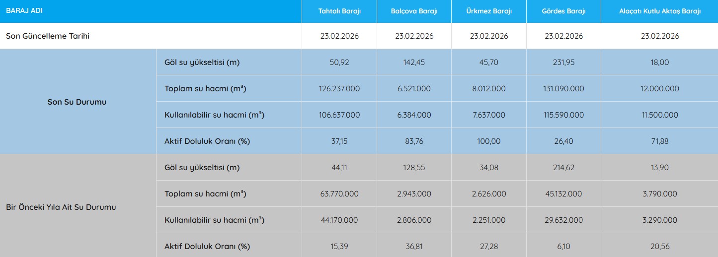 GERÇEKİZMİR - İzmir’de bir süredir etkili olan yağışlar, kentin su kaynaklarına olumlu yansıdı. 23 Şubat 2026 tarihli güncel İZSU verilerine göre barajlardaki doluluk oranlarında dikkat çeken artış sürüyor.