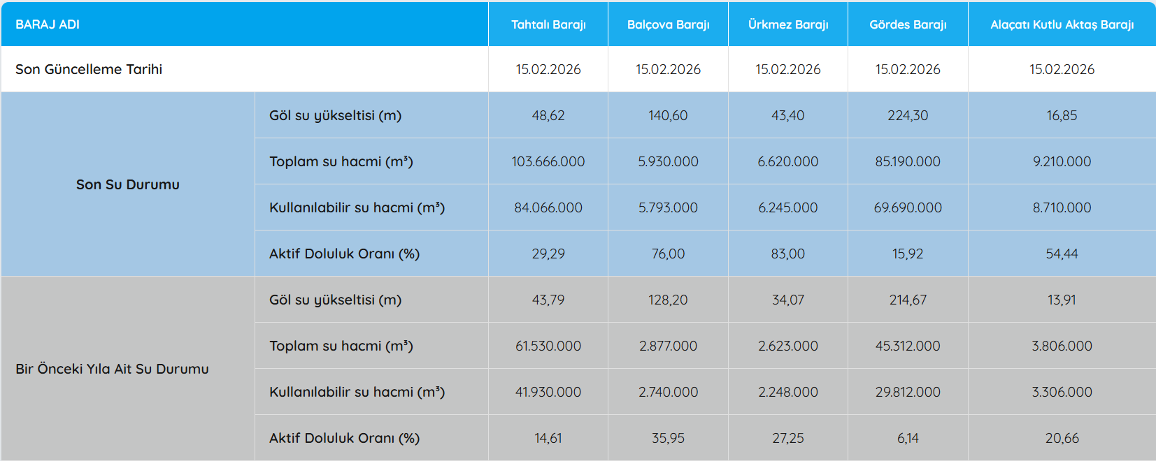 (15 Şubat 2026 Barajların Durumu)