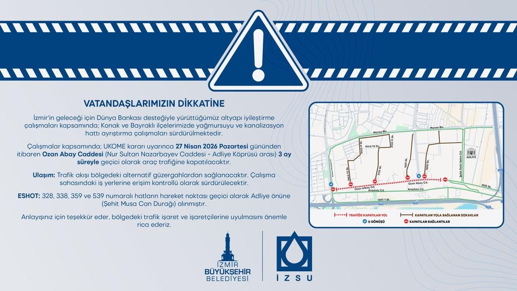 Çalışmalar kapsamında UKOME kararı ile Ozan Abay Caddesi’nin Nur Sultan Nazarbayev Caddesi ile Adliye Köprüsü katılım kolları arası kazı çalışmaları nedeniyle yol 27 Nisan 2026 (pazartesi ) tarihinden itibaren geçici olarak trafiğe kapatılacak olup, yapımı tamamlanan trafiğe kapalı alanlar Sultan Nazarbayev Caddesi istikametinden başlamak üzere tekrar trafiğe açılacaktır.