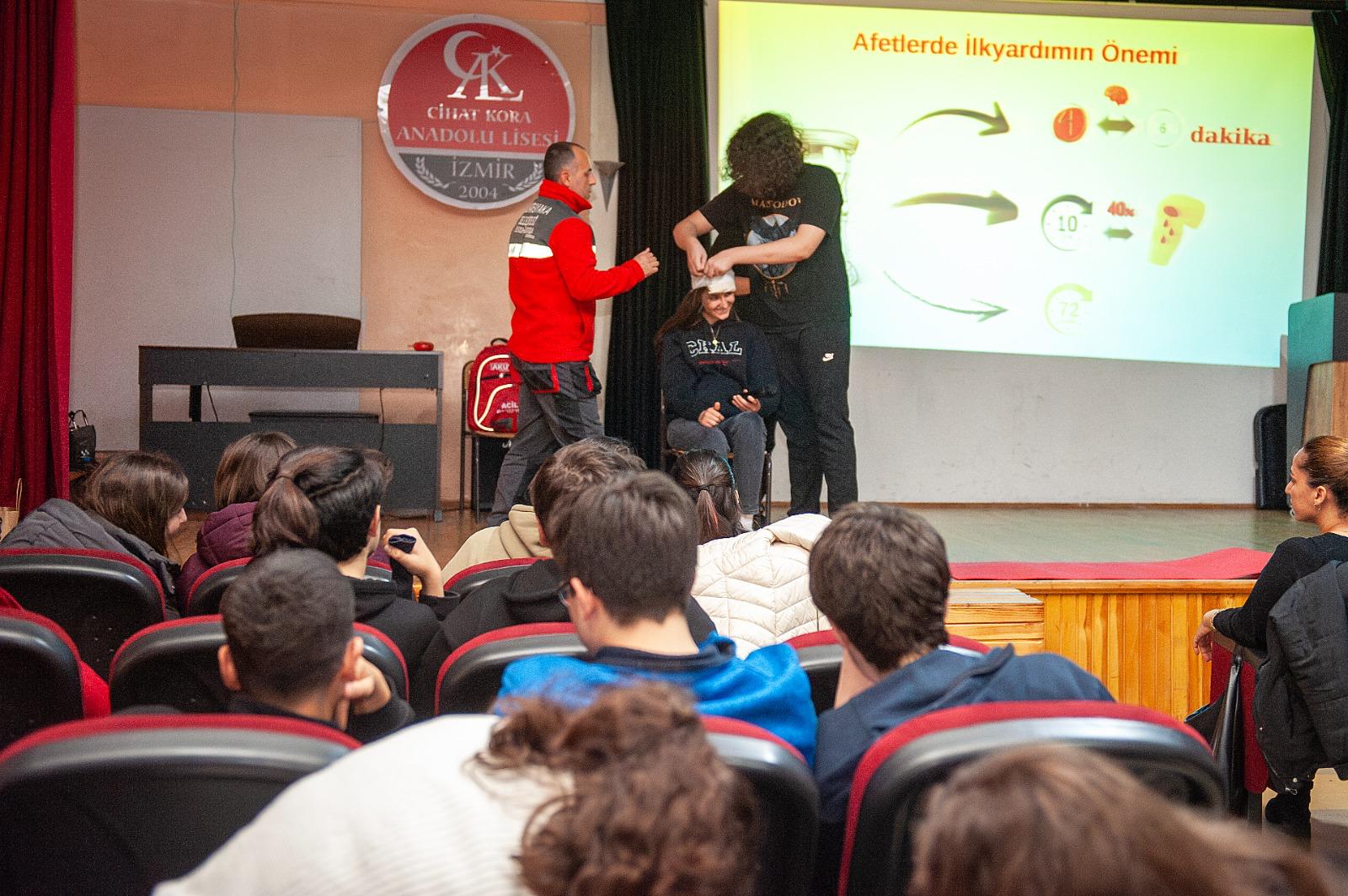 Eğitim çalışmaları kapsamında öğrencilere deprem öncesinde, anında ve sonrasında yapılması gerekenler uygulamalı bir sunumla anlatıldı. Bunun yanı sıra öğrencilere yangın sınıfları, yangına doğru müdahale teknikleri, yangın tüpü kullanımı ve güvenli tahliye yöntemleri aktarıldı. Afet anlarında hayati önem taşıyan ilk yardım konusuna da geniş yer ayrılan programda; kanamalara müdahale, hastanın ilk değerlendirmesi ve geçici sedye oluşturma teknikleri detaylandırıldı. Solunum ve kalp durması gibi kritik durumlarda yapılması gereken müdahaleler ise tiyatral bir gösteriyle canlandırılarak öğrencilere uygulamalı eğitim verildi. Hafta boyunca devam eden etkinlikler kapsamında Karşıyaka 15 Temmuz Şehitler Anadolu Lisesi ve Havva Özişbakan Anadolu Lisesi öğrencileri de benzer eğitimler ile buluşturuldu.