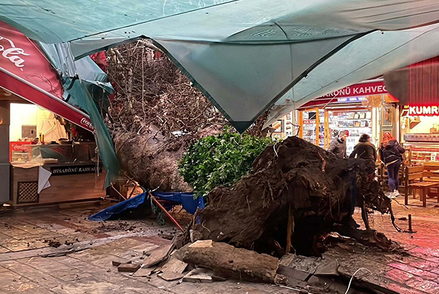 İzmir'de sağanak yağmur ve rüzgar olumsuzluk yaratıyor. Tarihi Kemeraltı Çarşısı'nda bulunan Hisarönü caminin önünde yer alan meydandaki asırlık çınar ağacı kökünden devrildi. Yüzlerce insanın uğrak yerlerinden birinde gerçekleşen olayda yaralanan olmadı. (DHA)
