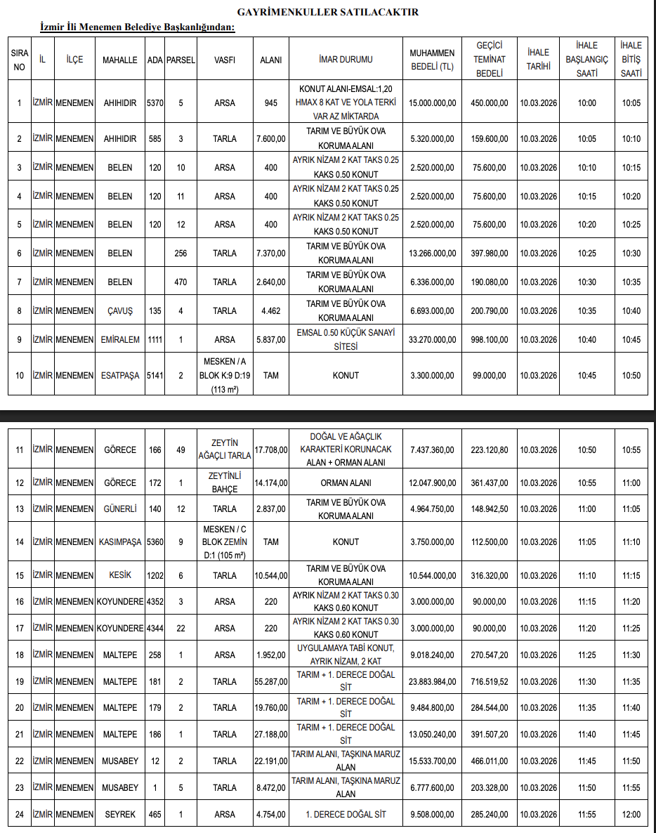Menemen Belediyesi, aralarında tarım ve 1. derece doğal sit alanlarının da bulunduğu 49 taşınmazı ihale ile satışa çıkarıyor. 10-11 Mart 2026’da yapılacak ihaleler sonucunda belediyenin kasasına 563 milyon 804 bin 394 TL girmesi bekleniyor.