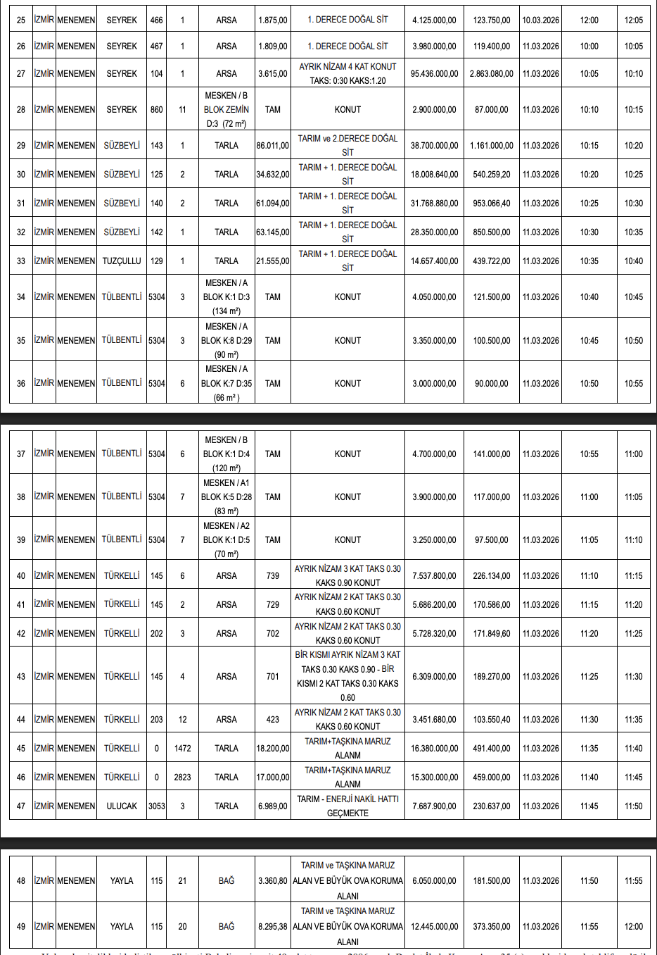 Satış listesinde yer alan taşınmazların bir kısmı tarım ve 1. derece doğal sit alanında, bir kısmı tarım ve büyük ova koruma alanında, bir kısmı konut imarlı, bir kısmı ise küçük sanayi sitesi ve ayrık nizam konut alanı imarında bulunuyor.