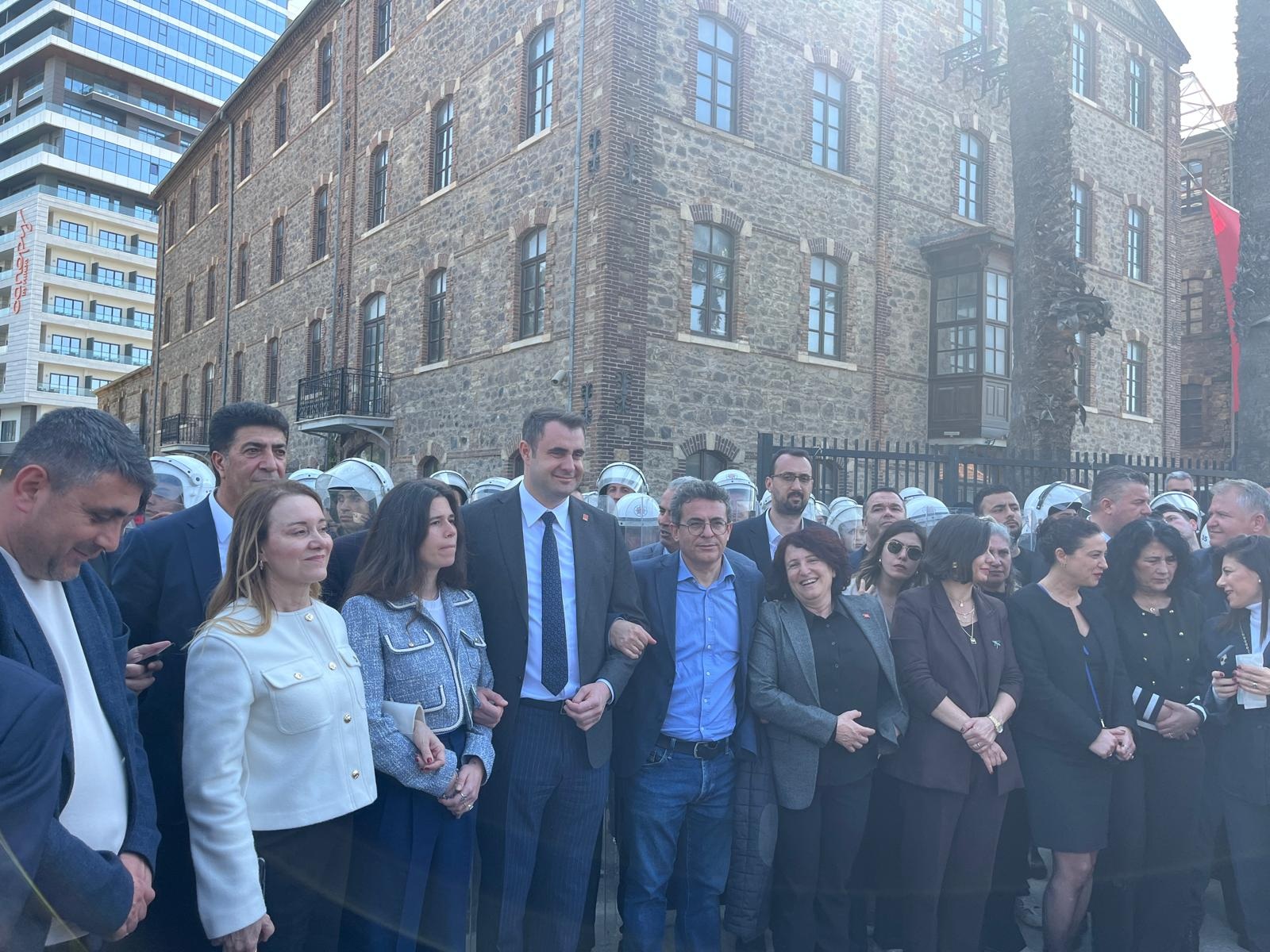 CHP İzmir İl Örgütü sabah karşı polis eşliğinde gerçekleştirilen tahliye sonrasında Vakıflar Genel Müdürlüğü’ne devredilen Meslek Fabrikası önüne gelerek insan zinciri oluşturdu. İl Başkanı Çağatay Güç ve ilçe belediye başkanlarının da yer aldığı partililer Gündoğdu marşı söyledi.