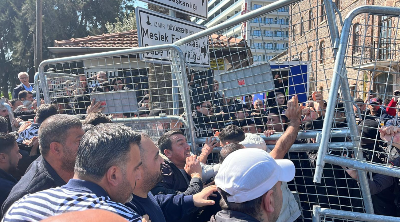 İzmir Büyükşehir Belediye Başkanı Cemil Tugay Fransa'da katılmak üzere olduğu programını iptal ederek İzmir'e geldi. Meslek Fabrikası önüne gelen Tugay polis barikatı ile karşılaştı. İçeri girmesine izin verilmedi.