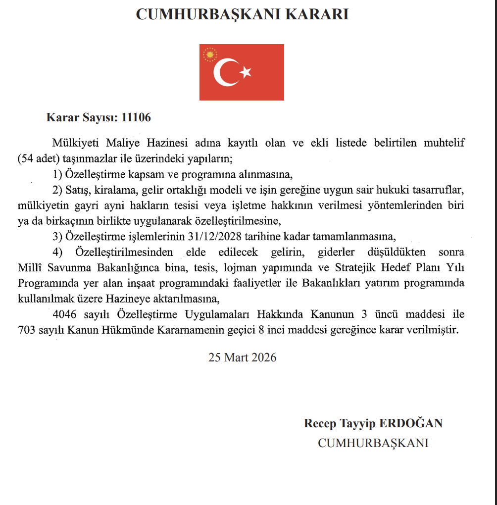 Cumhurbaşkanı kararıyla, mülkiyeti Maliye Hazinesi adına kayıtlı 54 taşınmaz ve üzerlerindeki yapılar özelleştirme kapsam ve programına dahil edildi. Karara göre söz konusu taşınmazlar; satış, kiralama, gelir ortaklığı modeli ya da işletme hakkının devri gibi yöntemlerle değerlendirilebilecek.