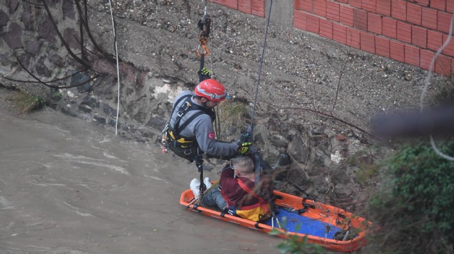 İzmir’de etkili olan sağanak yağış sırasında, 50–55 yaşlarındaki bir erkek Yeşildere’de dere içinde uyuduğu sırada yükselen sulara kapıldı. Yaklaşık 20 metre sürüklenen kişiyi tutunduğu noktada, ihbar üzerine olay yerine gelen İzmir Büyükşehir Belediyesi İtfaiye Dairesi Başkanlığı ekipleri kurtardı. Su seviyesinin yaklaşık 2 metreye ulaştığı dereye vinç yardımıyla inen ekipler vatandaşı bulunduğu noktadan kurtardı. Sedye ile yaklaşık 10 metrelik duvardan çıkarılan yurttaş, sağlık ekiplerine teslim edilerek hastaneye sevk edildi.
